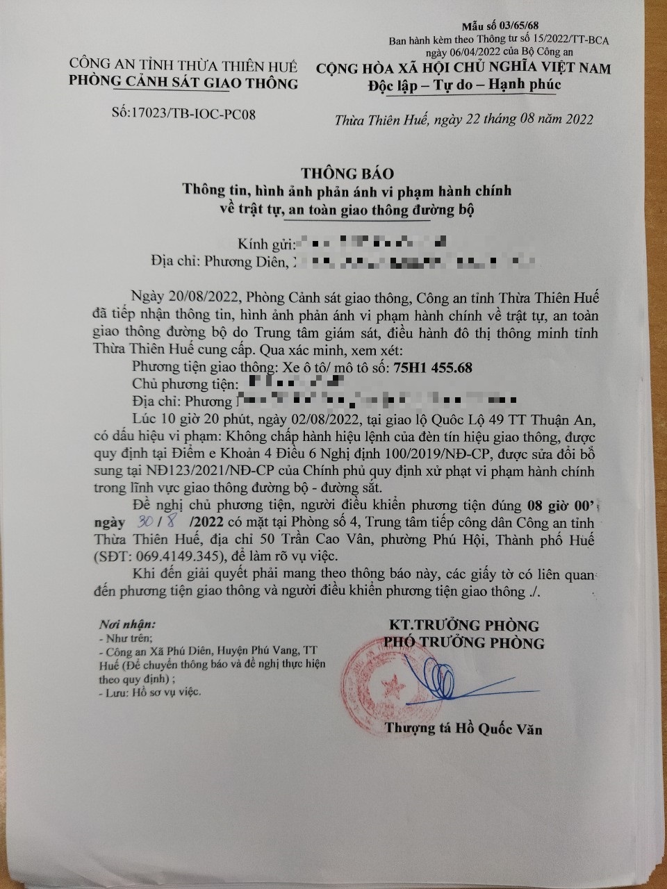 Vào lúc 10 giờ 20 phút, ngày 02/08/2022 Xe máy mang biển kiểm soát 75H145568 Không chấp hành hiệu lệnh của đèn tín hiệu giao thông tại địa điểm QL49 TT Thuận An