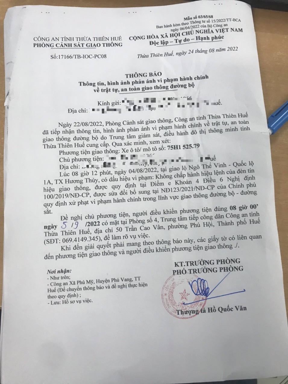 Vào lúc 08 giờ 12 phút, ngày 04/08/2022 Xe máy mang biển kiểm soát 75H152579 Không chấp hành hiệu lệnh của đèn tín hiệu giao thông tại địa điểm Ngô Thế Vinh - QL1A