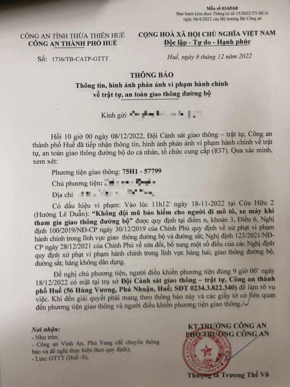 Vấn đề Ông/Bà phản ánh, Công an tỉnh đã chỉ đạo Công an thành phố Huế kiểm tra và xin thông báo kết quả xử lý như sau: