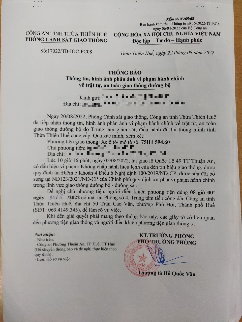 Vào lúc 10 giờ 16 phút, ngày 02/08/2022 Xe máy mang biển kiểm soát 75H159460 Không chấp hành hiệu lệnh của đèn tín hiệu giao thông tại địa điểm QL49 TT Thuận An