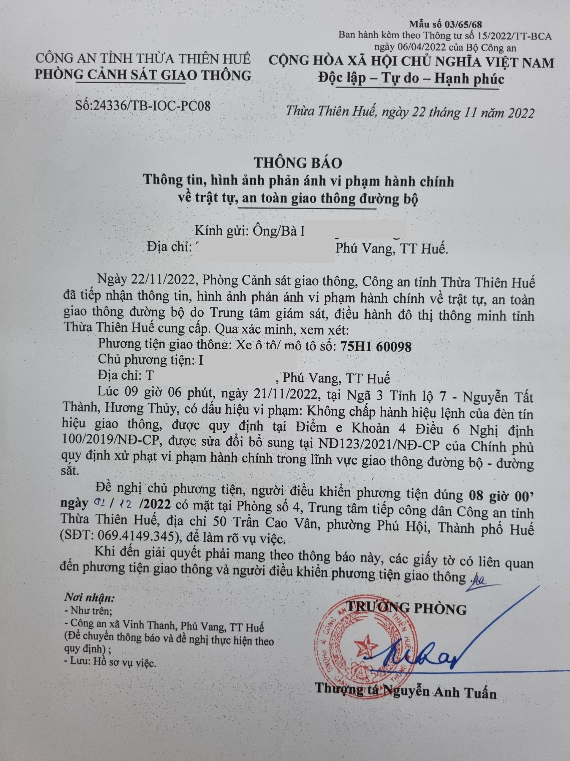 Phòng Cảnh sát giao thông xác định lỗi vi phạm của người điều khiển phương tiện 75H160098: Không chấp hành hiệu lệnh đèn tín hiệu giao thông, quy định tại điểm e, khoản 4, điều 6 Nghị định 100/2019/NĐ-CP được sửa đổi, bổ sung tại NĐ 123/2021/NĐ-CP.