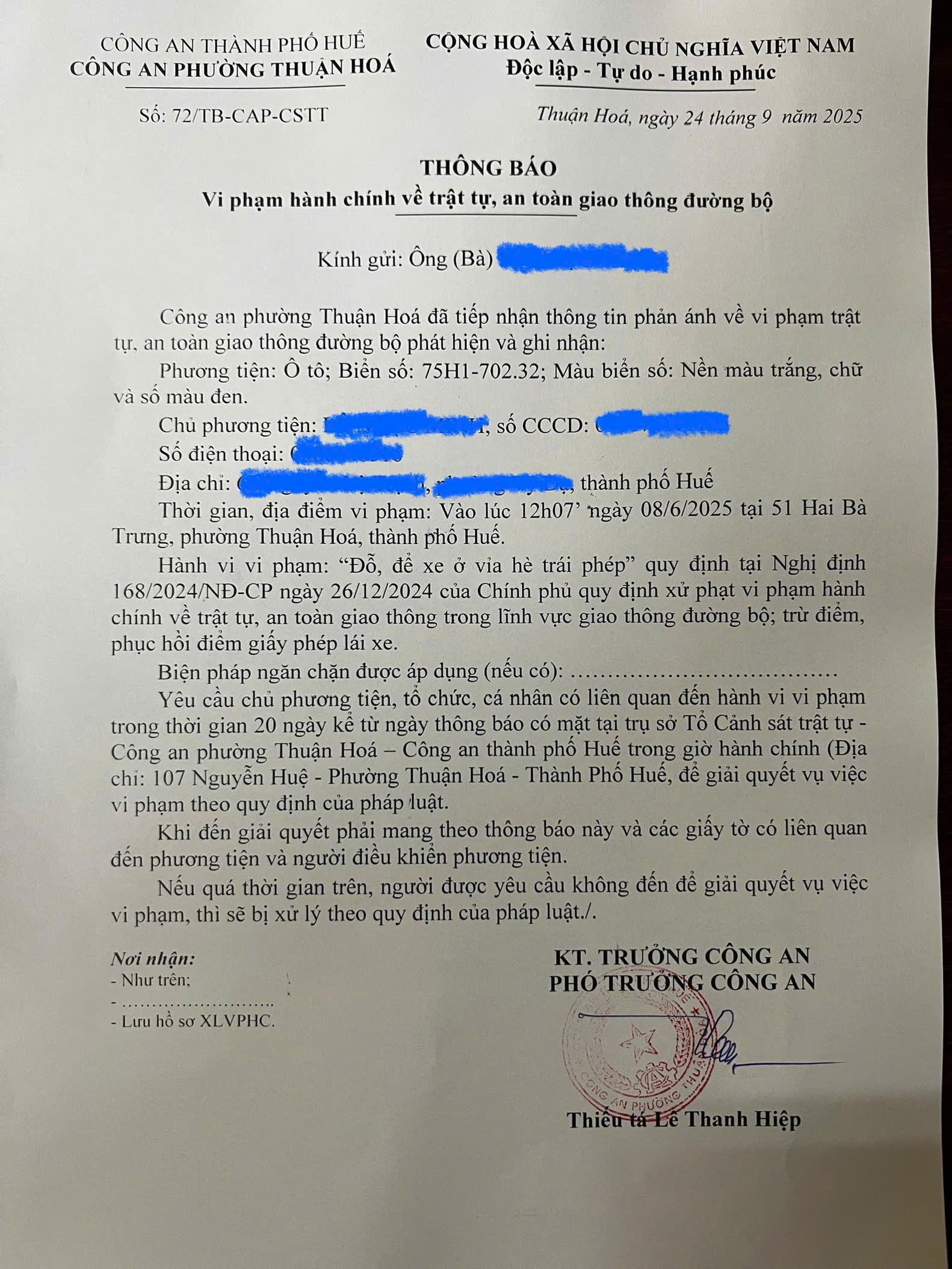 Công an phường Thuận Hoá đã gửi thông báo yêu cầu chủ phương tiện đến làm việc theo quy định của pháp luật. Đồng thời, gửi thông báo đến Công an xã/ phường/ thị trấn (nơi thường trú của chủ phương tiện). Tuy nhiên, đến nay, chủ phương tiện vẫn chưa đến làm việc theo ngày hẹn như yêu cầu.