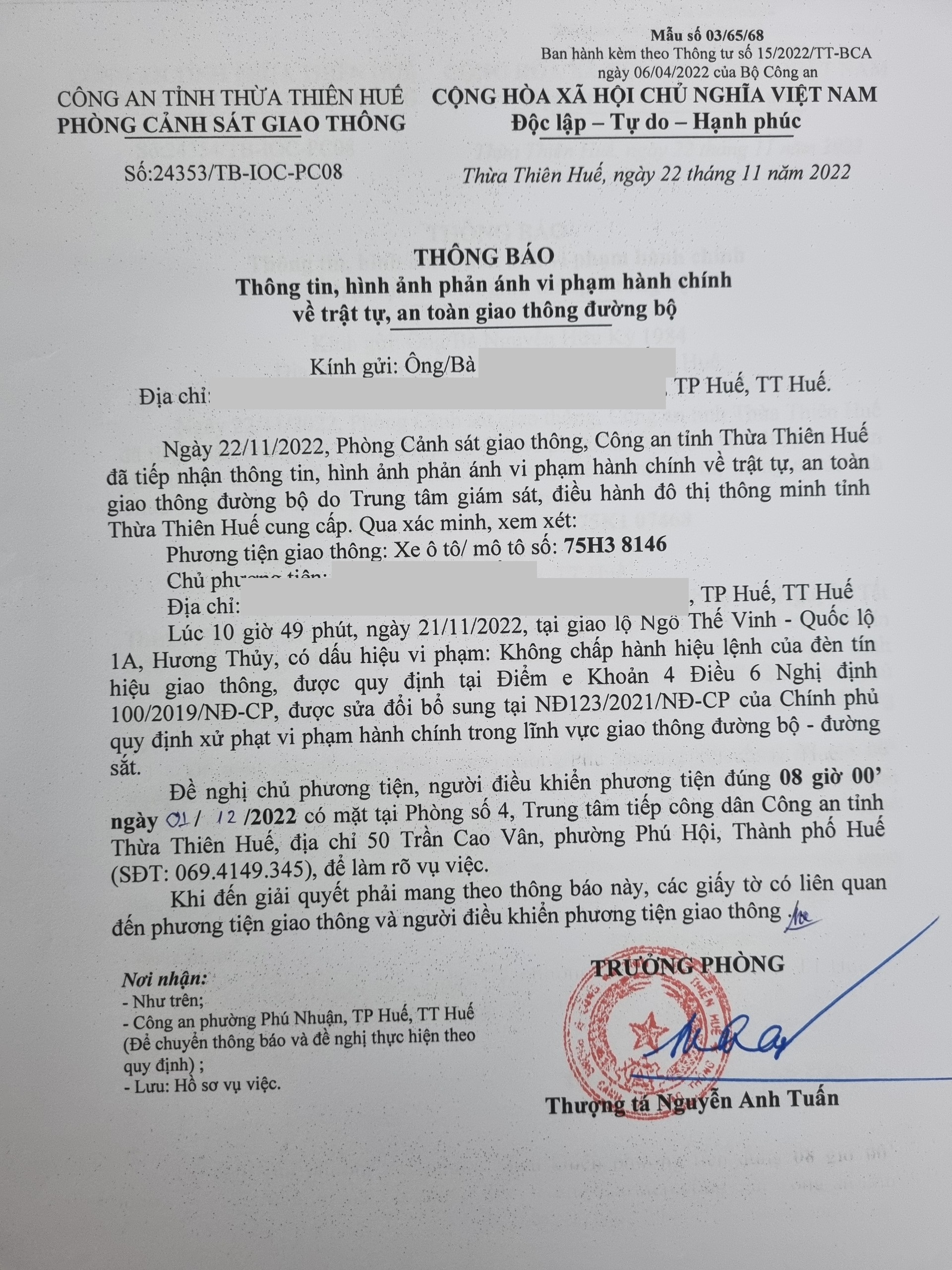 Phòng Cảnh sát giao thông xác định lỗi vi phạm của người điều khiển phương tiện 75H38146: Không chấp hành hiệu lệnh đèn tín hiệu giao thông, quy định tại điểm e, khoản 4, điều 6 Nghị định 100/2019/NĐ-CP được sửa đổi, bổ sung tại NĐ 123/2021/NĐ-CP.