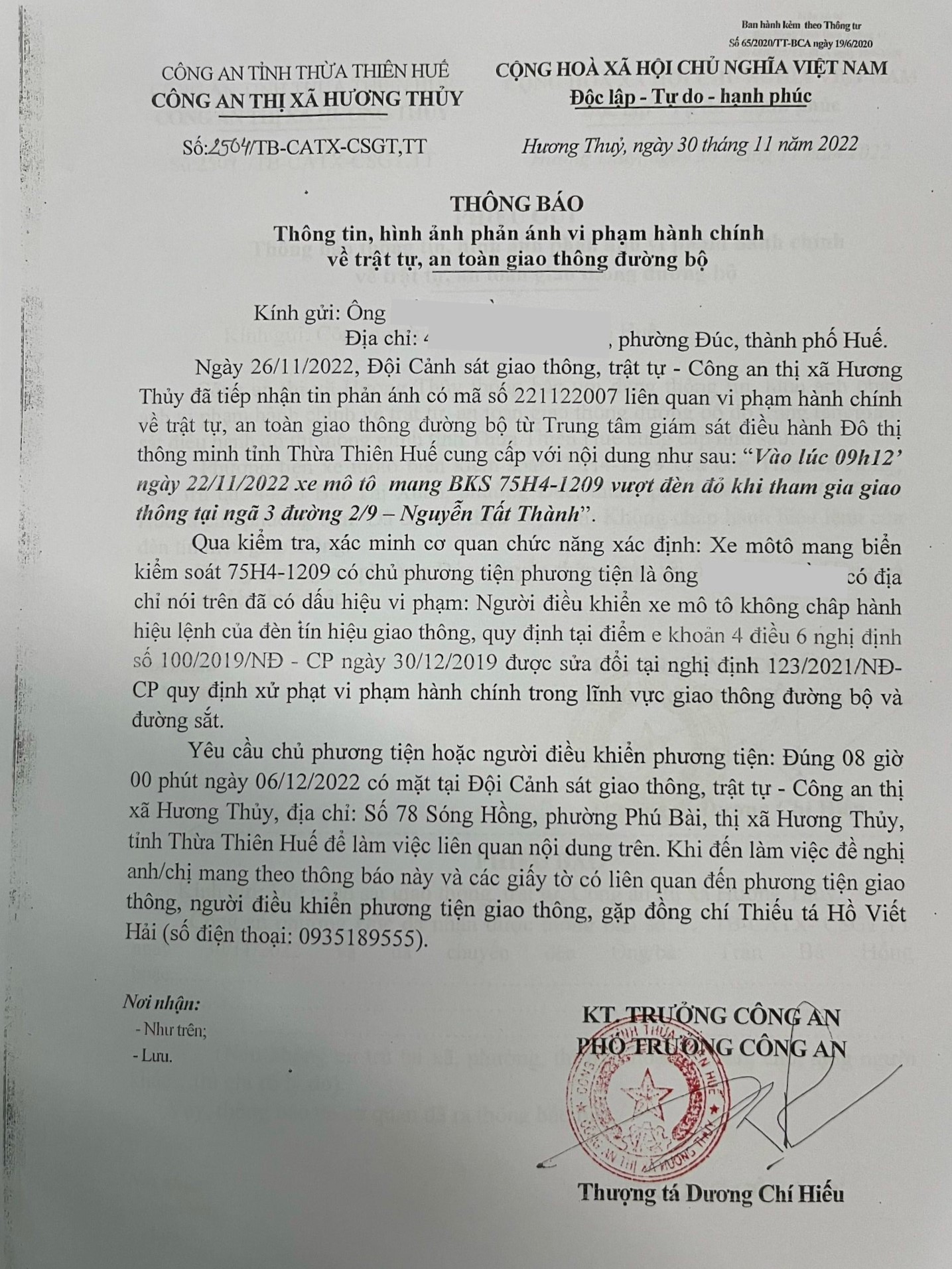 Vấn đề Ông/Bà phản ánh, Công an tỉnh đã chỉ đạo Công an thị xã Hương Thủy xin thông báo kết quả xử lý như sau: