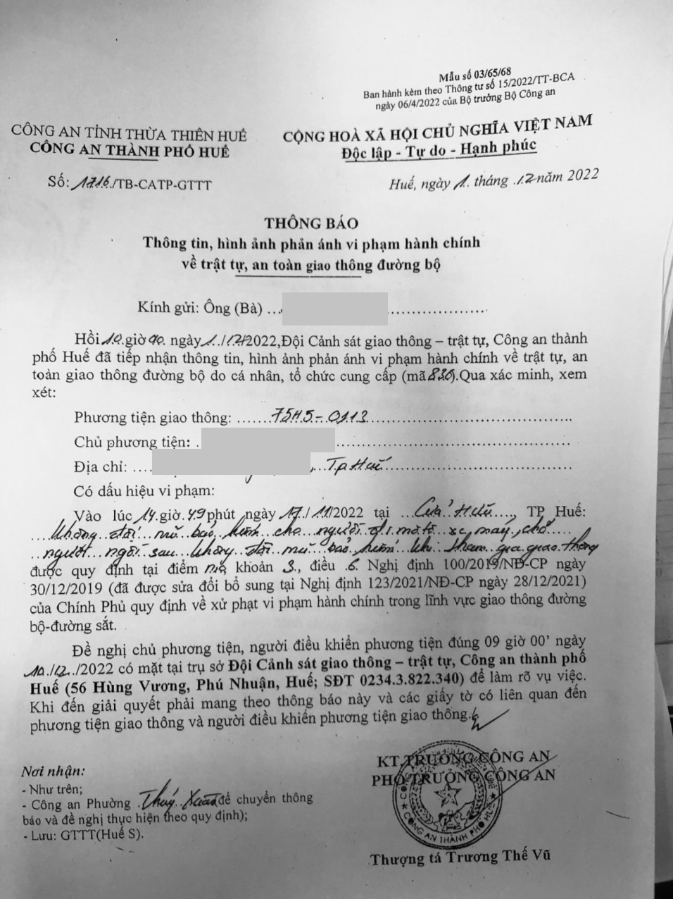 Vấn đề quý Ông/Bà phản ánh, Công an tỉnh đã chỉ đạo Công an thành phố Huế kiểm tra và xin thông báo kết quả xử lý như sau: