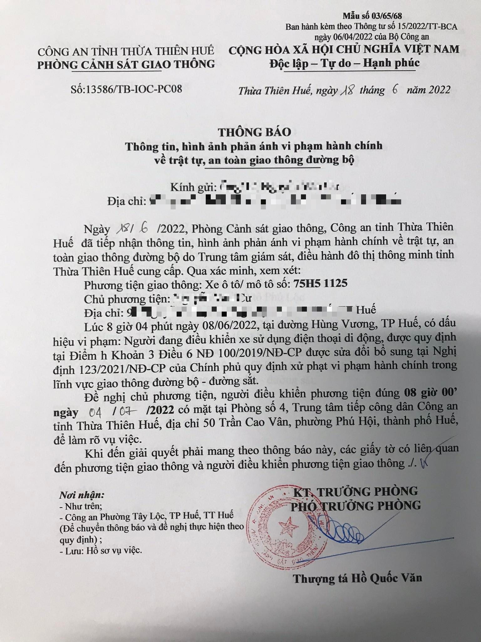 Phòng Cảnh sát giao thông xác định lỗi vi phạm của người điều khiển phương tiện 75H51125: Người đang điều khiển xe sử dụng điện thoại di động, quy định tại điểm h khoản 3 điều 6 Nghị định 100/2019/NĐ-CP được sửa đổi, bổ sung tại Nghị định 123/NĐ-CP ngày 28/12/2021.