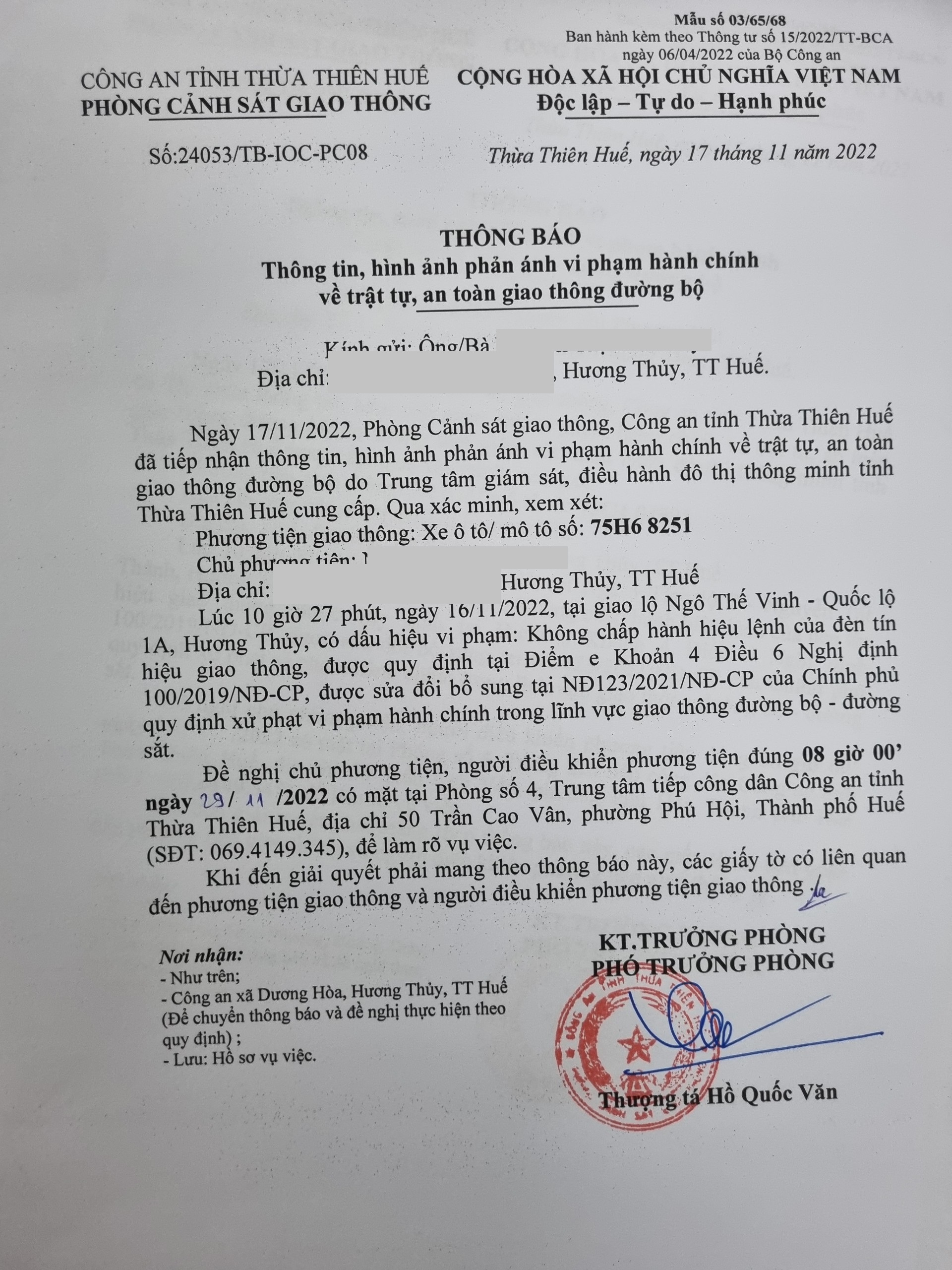 Phòng Cảnh sát giao thông xác định lỗi vi phạm của người điều khiển phương tiện 75H68251: Không chấp hành hiệu lệnh đèn tín hiệu giao thông, quy định tại điểm e, khoản 4, điều 6 Nghị định 100/2019/NĐ-CP được sửa đổi, bổ sung tại NĐ 123/2021/NĐ-CP.