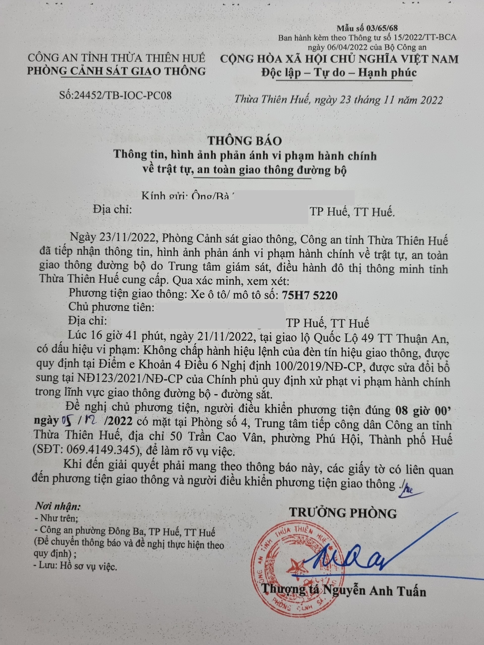 Phòng Cảnh sát giao thông xác định lỗi vi phạm của người điều khiển phương tiện 75H75220: Không chấp hành hiệu lệnh đèn tín hiệu giao thông, quy định tại điểm e, khoản 4, điều 6 Nghị định 100/2019/NĐ-CP được sửa đổi, bổ sung tại NĐ 123/2021/NĐ-CP.