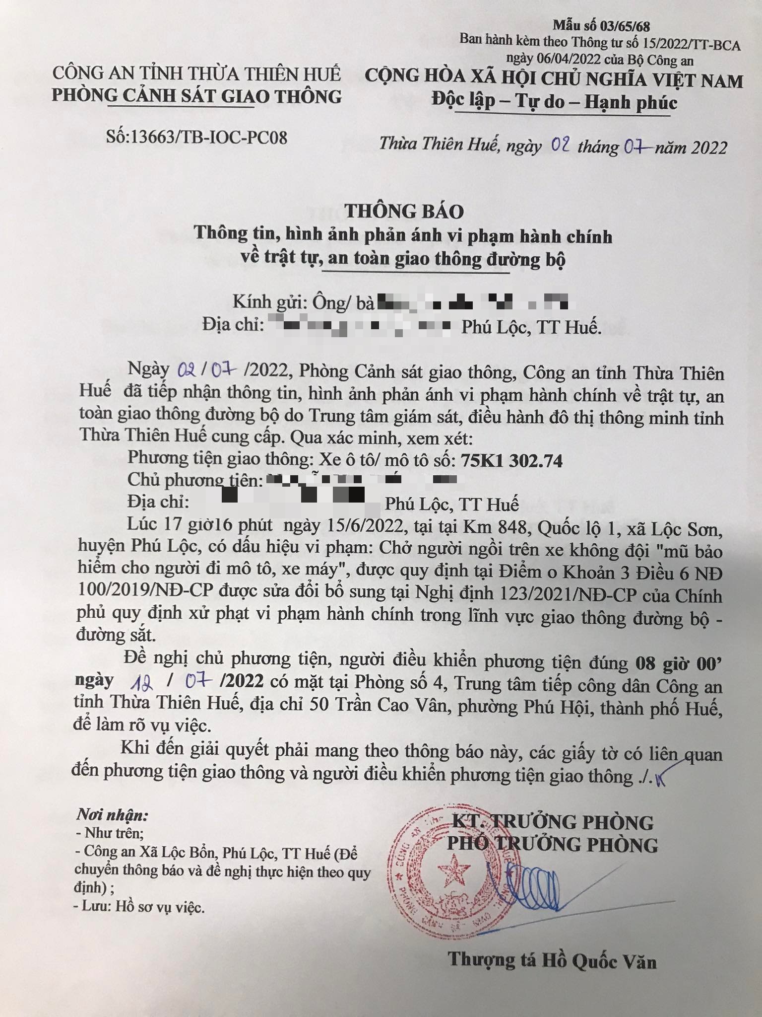 Qua hình ảnh được cung cấp, xác định người điều khiển phương tiện 75K130274 vi phạm lỗi: Chở người ngồi trên xe không đội "mũ bảo hiểm cho người đi mô tô, xe máy" (quy định tại điểm o, khoản 3, Điều 6 Nghị định 100/2019/NĐ-CP, sửa đổi bổ sung tại Nghị định 123/2021/NĐ-CP). Phòng Cảnh sát giao thông đã gửi thông báo, yêu cầu chủ phương tiện đến làm việc vào ngày 12/7/2022.