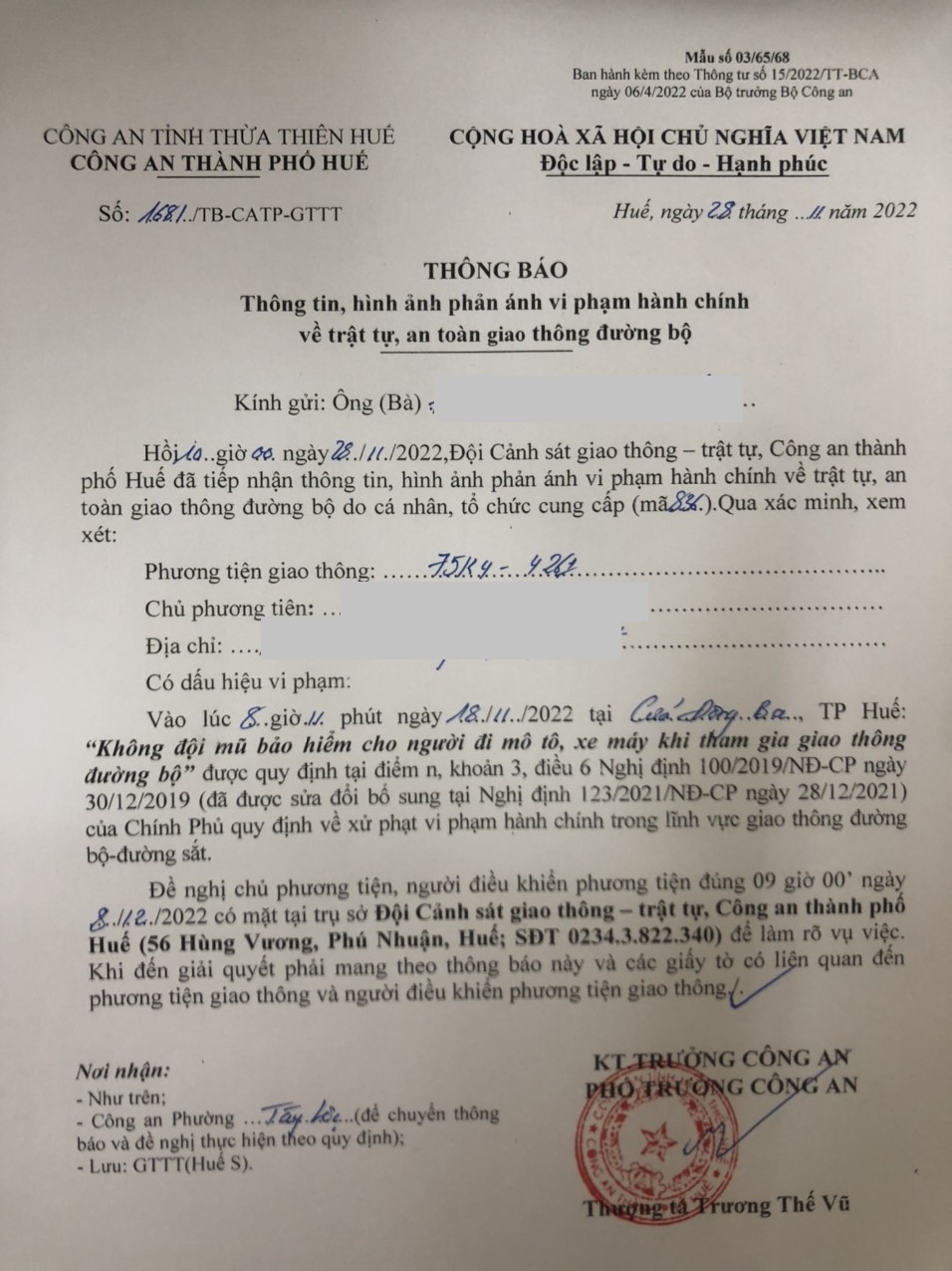 Vấn đề quý Ông/Bà phản ánh, Công an tỉnh đã chỉ đạo Công an thành phố Huế kiểm tra và xin thông báo kết quả xử lý như sau: