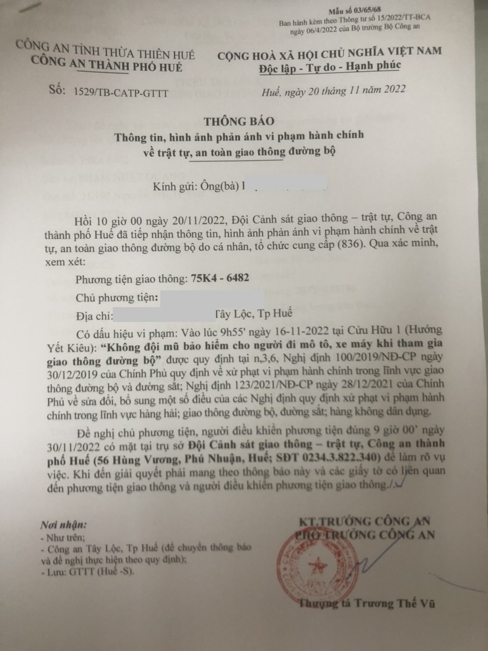 Qua hình ảnh được cung cấp, xác định người điều khiển phương tiện 75K46482 vi phạm lỗi: Không đội "mũ bảo hiểm cho người đi mô tô, xe máy", (quy định tại điểm n khoản 3, Điều 6 Nghị định 100/2019/NĐ-CP, sửa đổi bổ sung tại Nghị định 123/2021/NĐ-CP). Công an thành phố Huế đã gửi thông báo, yêu cầu chủ phương tiện đến làm việc theo quy định. Tuy nhiên, hiện chủ phương tiện vẫn chưa trình diện tại cơ quan. Công an thành phố Huế sẽ tiếp tục thông báo các tổ tuần tra kiểm soát trên địa bàn, trong quá trình làm nhiệm vụ nếu phát hiện sẽ tiến hành dừng xe để xử lý.