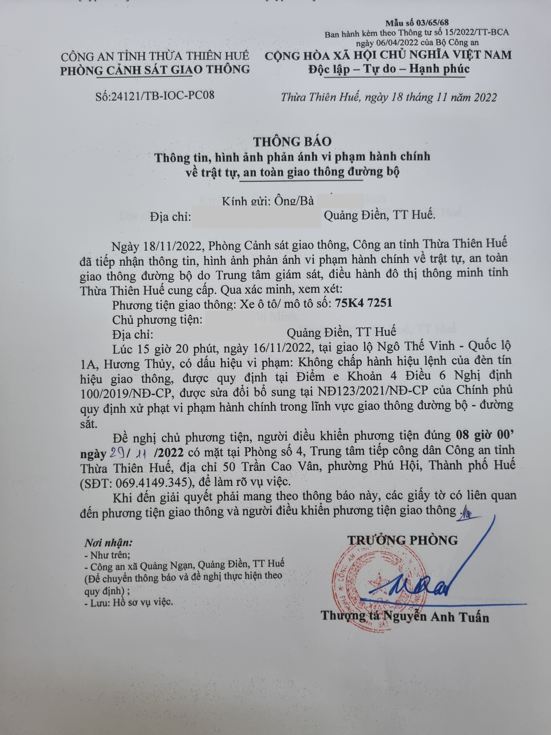 Phòng Cảnh sát giao thông đã xác minh, làm rõ xe mô tô BKS 75K47251 vi phạm lỗi: "Không chấp hành hiệu lệnh của đèn tín hiệu giao thông" quy định tại điểm e Khoản 4, Điều 6 Nghị định 100/2019/NĐ-CP, sửa đổi bổ sung tại Nghị định 123/2021/NĐ-CP của Chính phủ. Phòng Cảnh sát giao thông đã gửi thông báo, yêu cầu chủ phương tiện đến làm việc theo quy định. Tuy nhiên, hiện chủ phương tiện vẫn chưa trình diện tại cơ quan. Phòng Cảnh sát giao thông sẽ tiếp tục thông báo Công an địa phương nơi chủ phương tiện thường trú; đồng thời, thông báo các tổ tuần tra kiểm soát trên địa bàn, trong quá trình làm nhiệm vụ nếu phát hiện sẽ tiến hành dừng xe để xử lý.