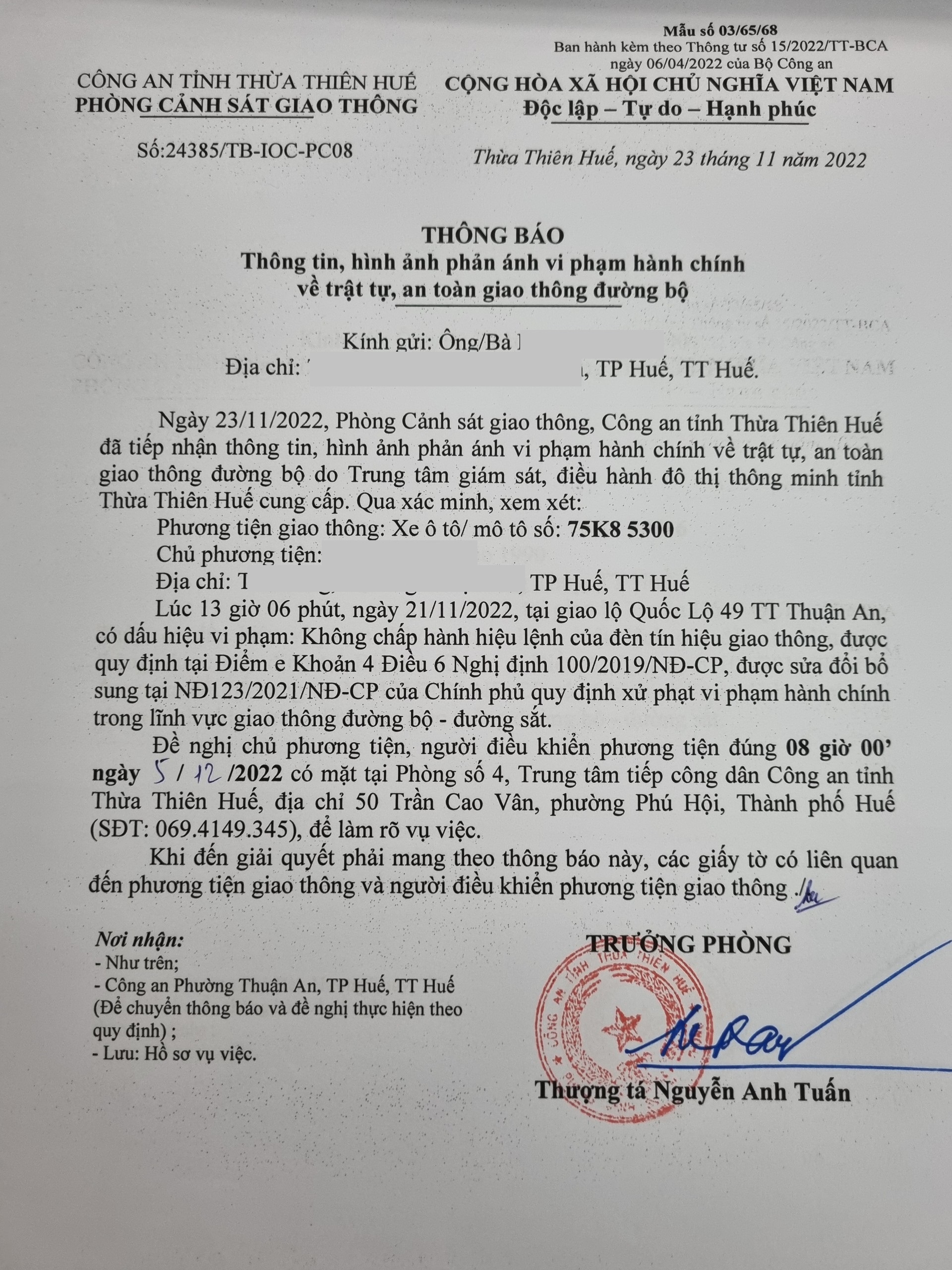 Phòng Cảnh sát giao thông xác định lỗi vi phạm của người điều khiển phương tiện 75K85300: Không chấp hành hiệu lệnh đèn tín hiệu giao thông, quy định tại điểm e, khoản 4, điều 6 Nghị định 100/2019/NĐ-CP được sửa đổi, bổ sung tại NĐ 123/2021/NĐ-CP.