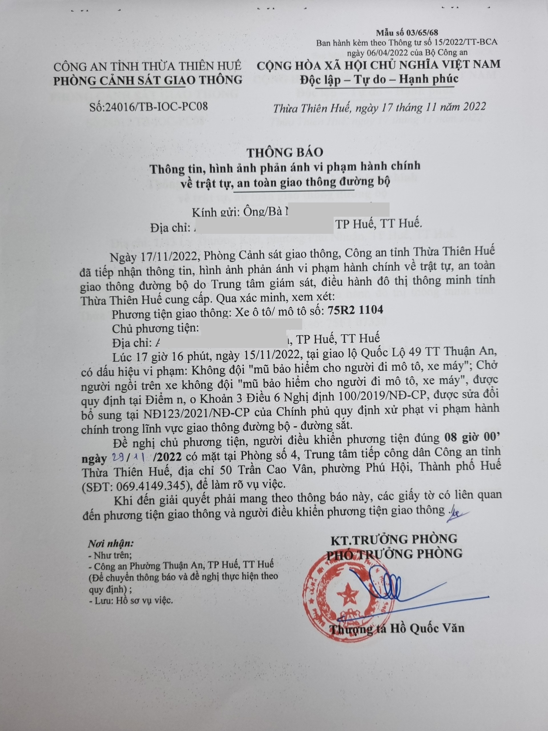Qua hình ảnh được cung cấp, xác định người điều khiển phương tiện 75R21104 vi phạm lỗi: Không đội "mũ bảo hiểm cho người đi mô tô, xe máy"; chở người ngồi trên xe không đội "mũ bảo hiểm cho người đi mô tô, xe máy", (quy định tại điểm n,o khoản 3, Điều 6 Nghị định 100/2019/NĐ-CP, sửa đổi bổ sung tại Nghị định 123/2021/NĐ-CP). Phòng Cảnh sát giao thông đã gửi thông báo, yêu cầu chủ phương tiện đến làm việc theo quy định. Tuy nhiên, hiện chủ phương tiện vẫn chưa trình diện tại cơ quan. Phòng Cảnh sát giao thông sẽ tiếp tục thông báo Công an địa phương nơi chủ phương tiện thường trú; đồng thời, thông báo các tổ tuần tra kiểm soát trên địa bàn, trong quá trình làm nhiệm vụ nếu phát hiện sẽ tiến hành dừng xe để xử lý.