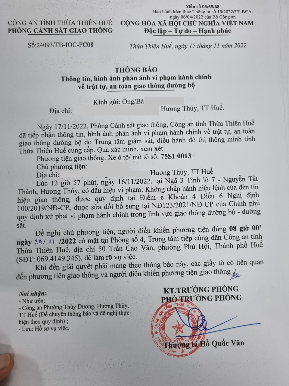 Phòng Cảnh sát giao thông xác định lỗi vi phạm của người điều khiển phương tiện 75S10013: Không chấp hành hiệu lệnh đèn tín hiệu giao thông, quy định tại điểm e, khoản 4, điều 6 Nghị định 100/2019/NĐ-CP được sửa đổi, bổ sung tại NĐ 123/2021/NĐ-CP.