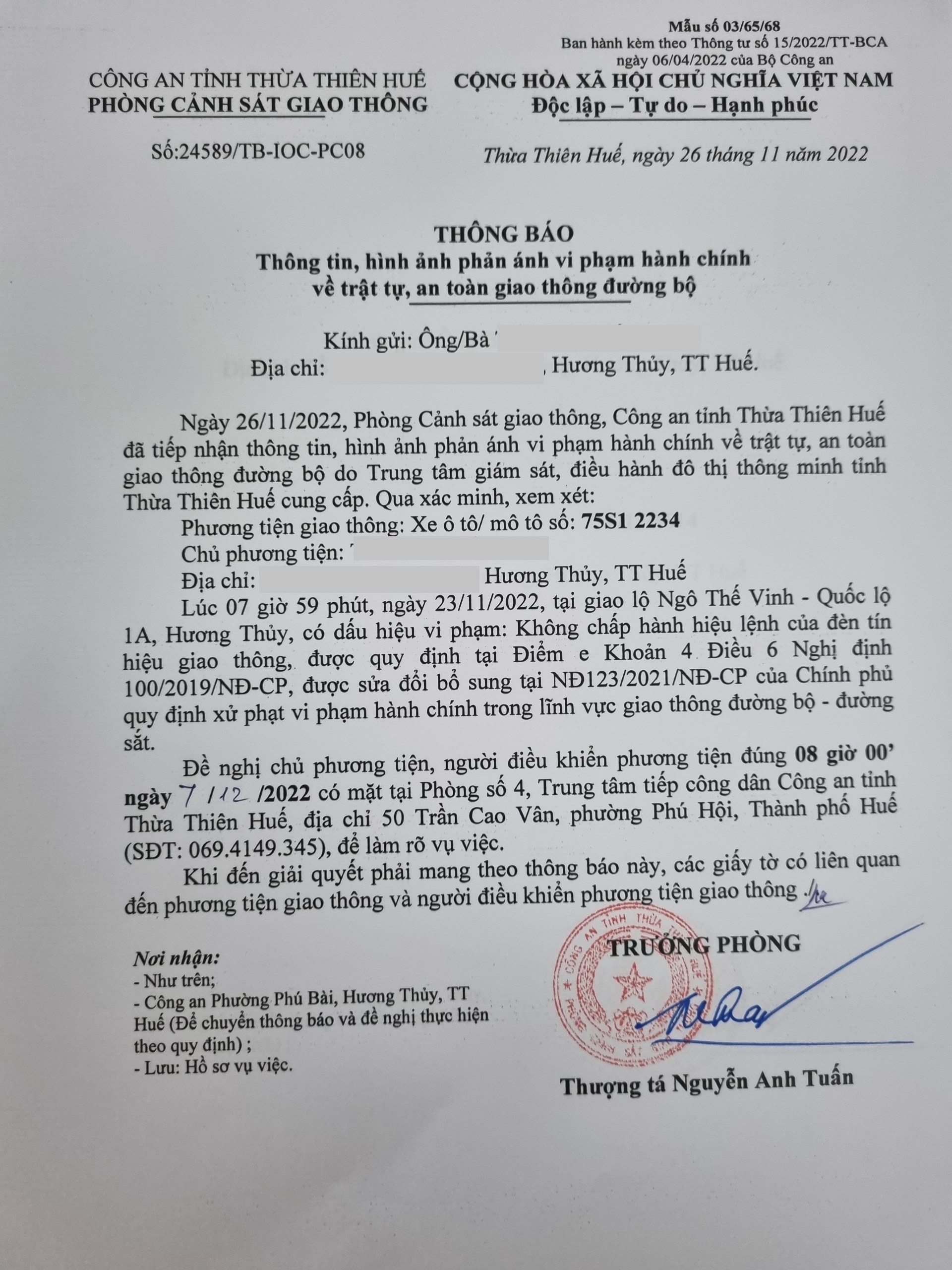 Phòng Cảnh sát giao thông xác định lỗi vi phạm của người điều khiển phương tiện 75S12234: Không chấp hành hiệu lệnh đèn tín hiệu giao thông, quy định tại điểm e, khoản 4, điều 6 Nghị định 100/2019/NĐ-CP được sửa đổi, bổ sung tại NĐ 123/2021/NĐ-CP.