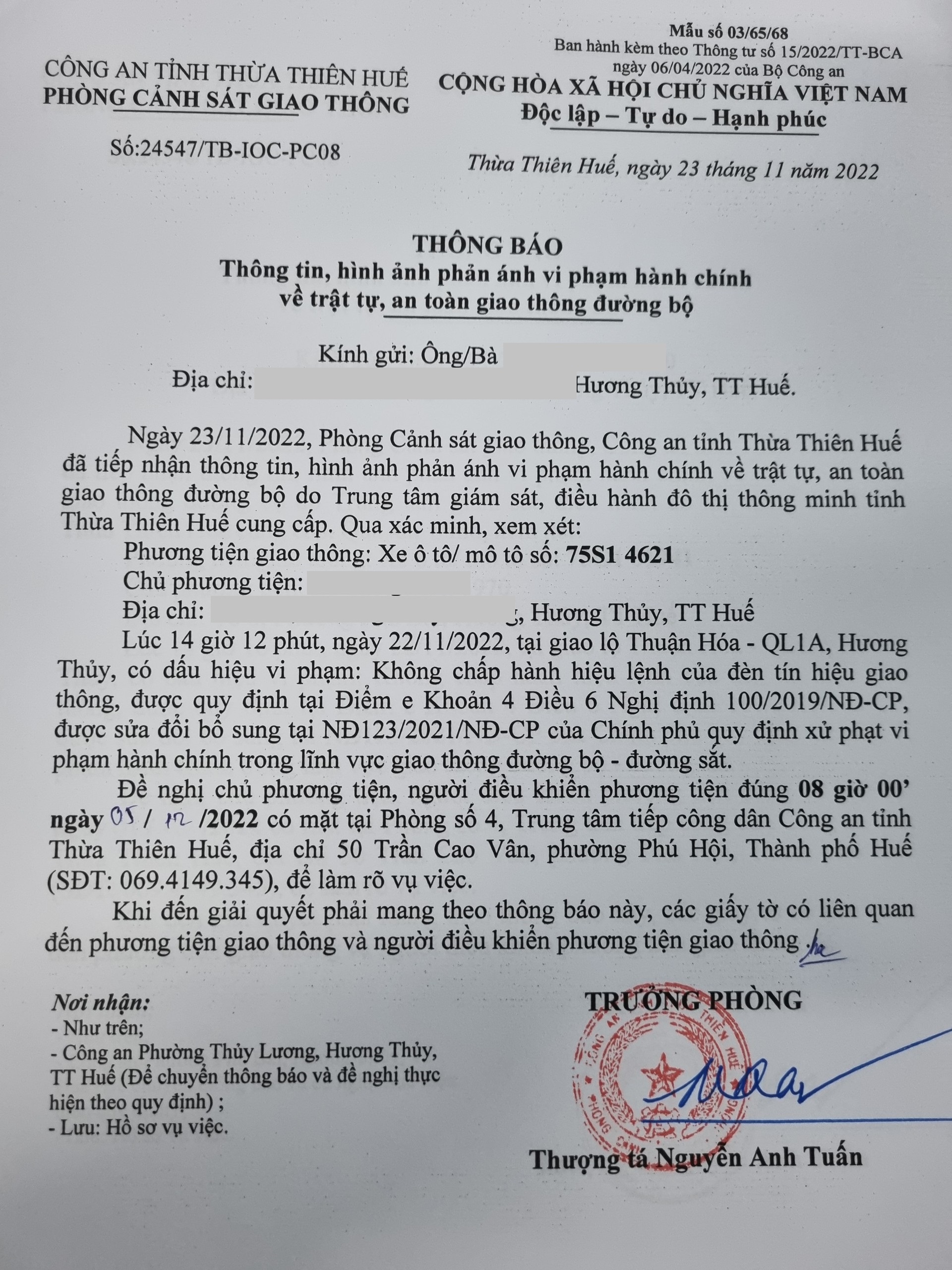 Phòng Cảnh sát giao thông xác định lỗi vi phạm của người điều khiển phương tiện 75S14621: Không chấp hành hiệu lệnh đèn tín hiệu giao thông, quy định tại điểm e, khoản 4, điều 6 Nghị định 100/2019/NĐ-CP được sửa đổi, bổ sung tại NĐ 123/2021/NĐ-CP.