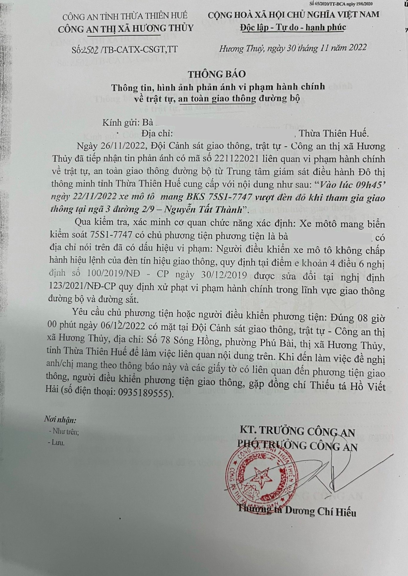 Vấn đề Ông/Bà phản ánh, Công an tỉnh đã chỉ đạo Công an thị xã Hương Thủy xin thông báo kết quả xử lý như sau: