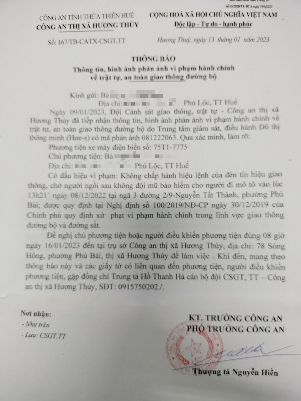 Vấn đề Ông/Bà phản ánh, Công an tỉnh đã chỉ đạo Công an thị xã Hương Thủy xin thông báo kết quả xử lý như sau: