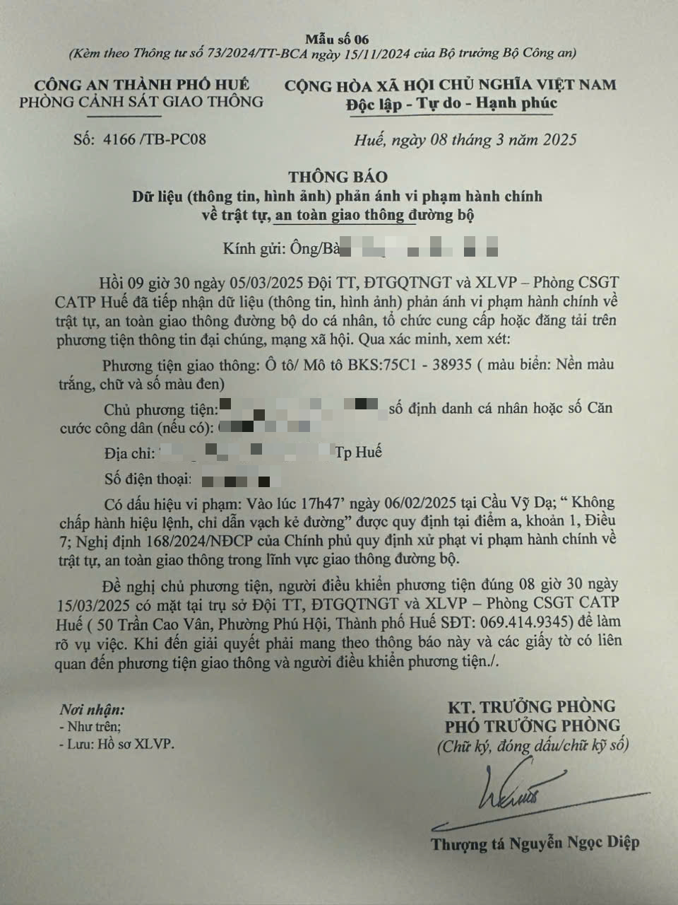 Phòng Cảnh sát giao thông đã gửi thông báo yêu cầu chủ phương tiện đến làm việc. Đồng thời, gửi thông báo đến Công an xã/ phường/ thị trấn (nơi thường trú của chủ phương tiện). Tuy nhiên, đến nay chủ phương tiện vẫn chưa đến làm việc theo yêu cầu. Phòng Cảnh sát giao thông sẽ tiếp tục thông báo cho lực lượng tuần tra kiểm soát trên đường phát hiện, xử lý.