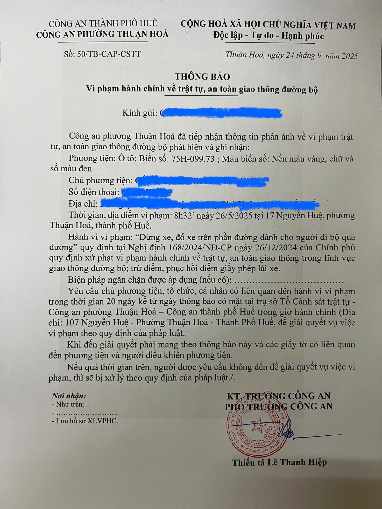 Công an phường Thuận Hóa đã lập hồ sơ, thông báo chủ phương tiện đến làm việc. Nếu quá ngày hẹn mà chủ phương tiện vẫn chưa đến trình diện tại cơ quan. Công an phường Thuận Hóa sẽ gửi thông báo cho cơ quan đăng kiểm để đưa phương tiện vào cảnh báo trên Chương trình Quản lý kiểm định.