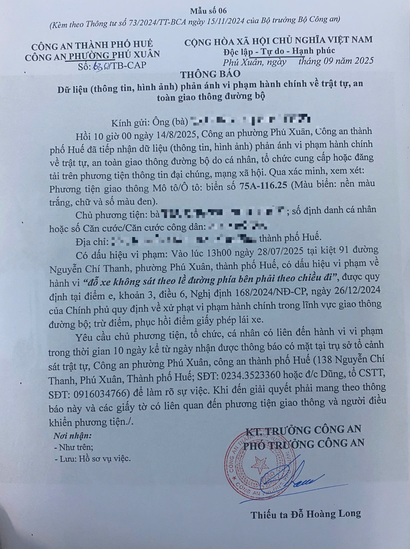 Công an phường Phú Xuân đã lập hồ sơ, thông báo chủ phương tiện đến làm việc. Tuy nhiên chủ phương tiện vẫn chưa đến trình diện tại cơ quan. Công an phường Phú Xuân sẽ gửi thông báo cho cơ quan đăng kiểm để đưa phương tiện vào cảnh báo trên Chương trình Quản lý kiểm định.
