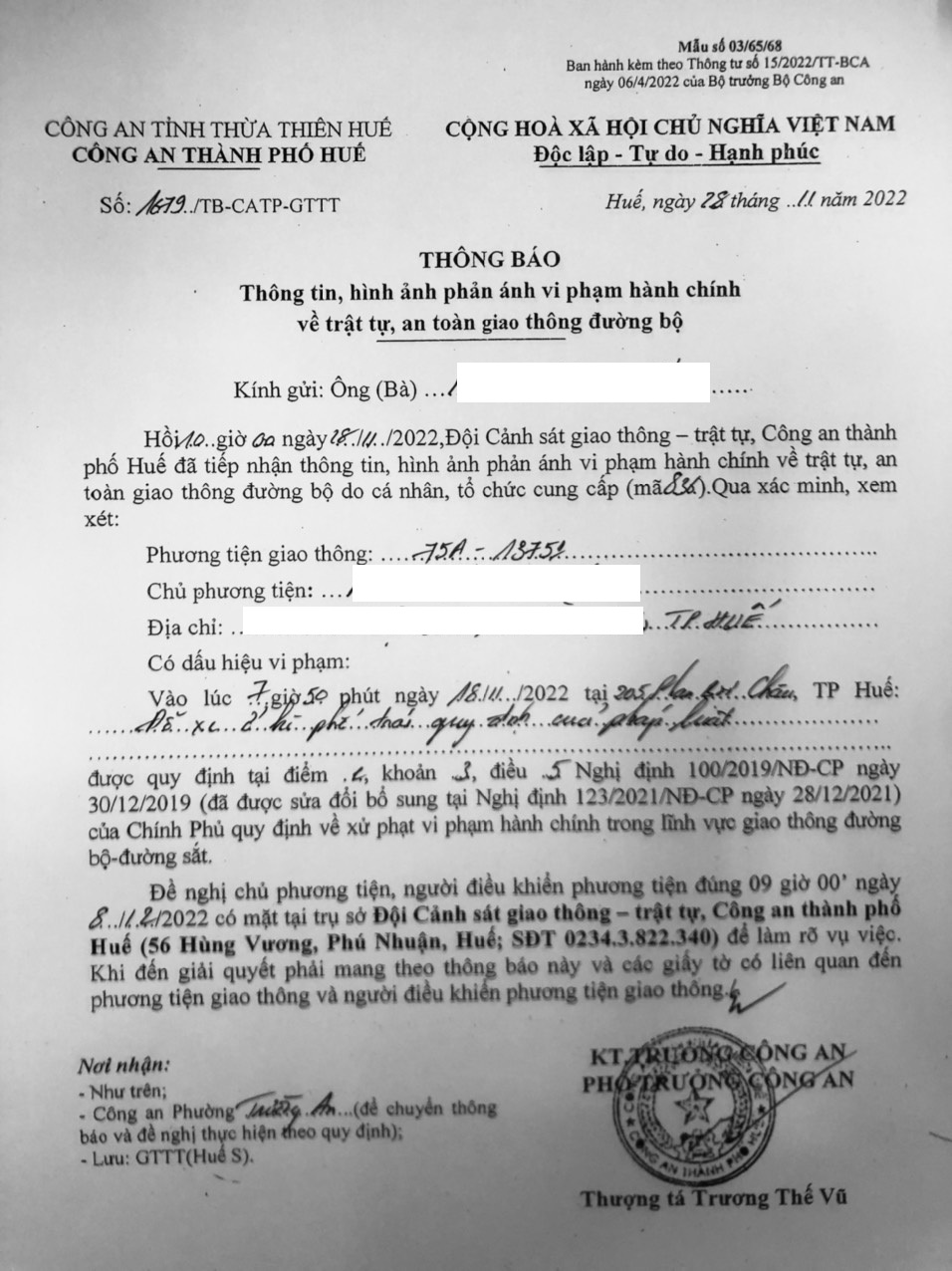 Vấn đề quý Ông/Bà phản ánh, Công an tỉnh đã chỉ đạo Công an thành phố Huế kiểm tra và xin thông báo kết quả xử lý như sau: