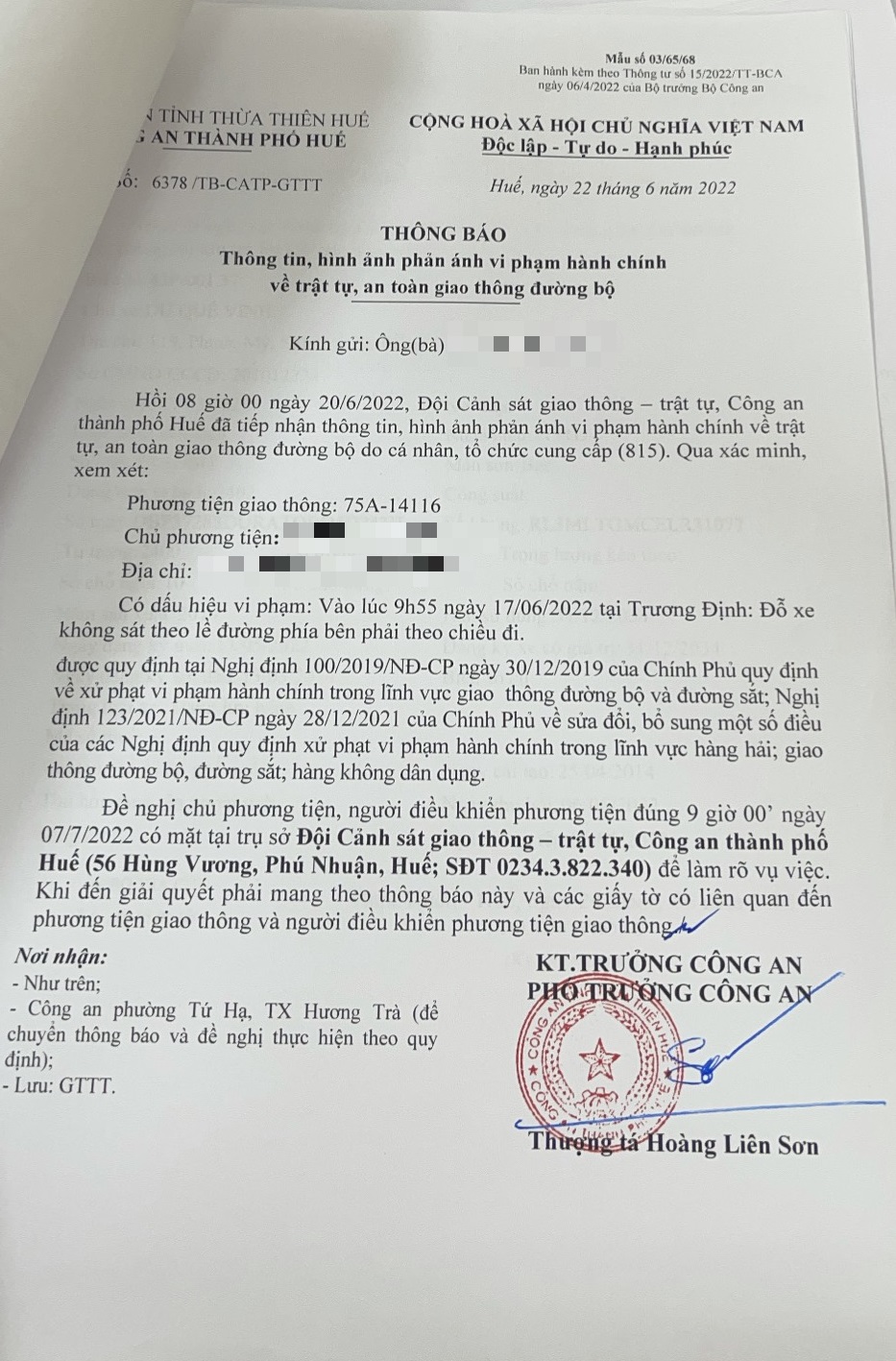 Công an thành phố đã lập hồ sơ, thông báo chủ phương tiện đến làm việc vào ngày 07/7/2022. Tuy nhiên, hiện chủ phương tiện vẫn chưa trình diện tại cơ quan. Công an thành phố sẽ gửi thông báo cho cơ quan đăng kiểm để đưa phương tiện vào cảnh báo trên Chương trình Quản lý kiểm định.
