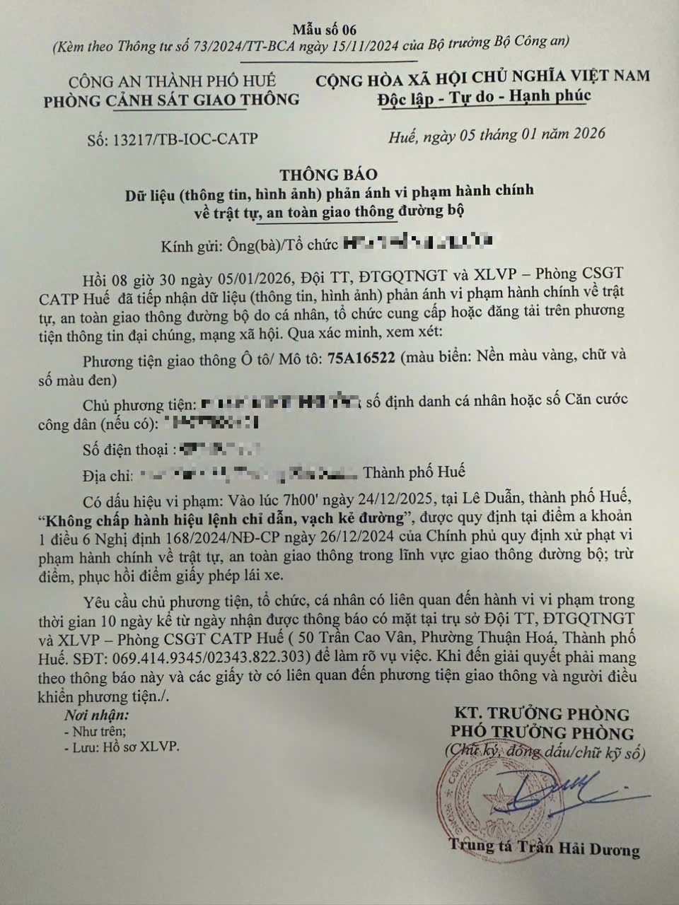 Qua hình ảnh phản ánh, Phòng Cảnh sát giao thông xác định lỗi vi phạm của người điều khiển phương tiện 75A16522 như sau: Không chấp hành hiệu lệnh, chỉ dẫn vạch kẻ đường, quy định tại điểm a, khoản 1, điều 6 Nghị định 168/2024/NĐ-CP.