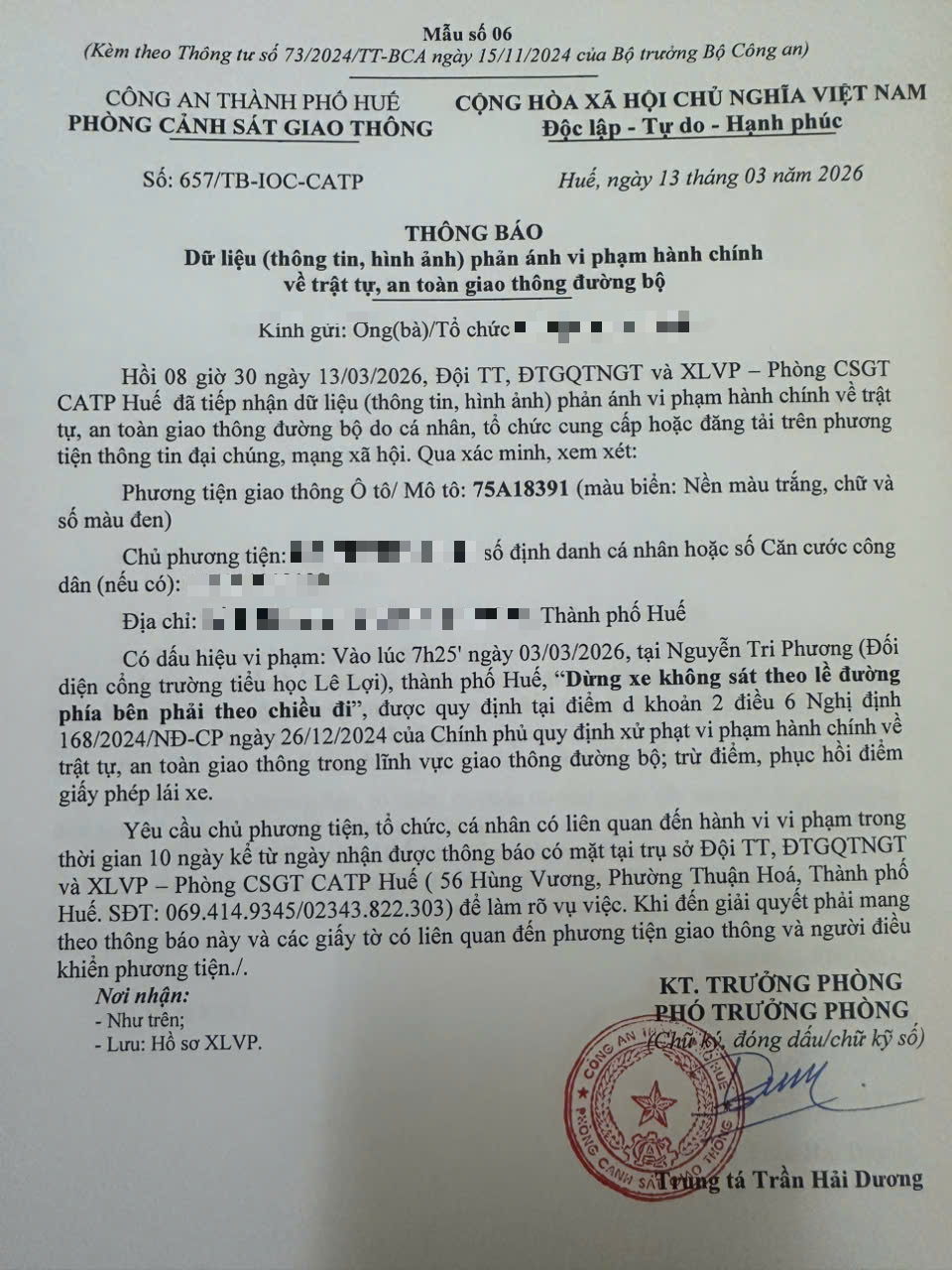 Qua hình ảnh phản ánh, Phòng Cảnh sát giao thông xác định lỗi vi phạm của người điều khiển phương tiện 75A18391 như sau: “Dừng xe không sát theo lề đường phía bên phải theo chiều đi”, quy định tại điểm d, khoản 2, điều 6 Nghị định 168/2024/NĐ-CP.