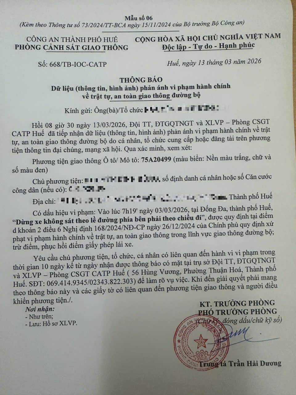 Qua hình ảnh phản ánh, Phòng Cảnh sát giao thông xác định lỗi vi phạm của người điều khiển phương tiện 75A20499 như sau: “Dừng xe không sát theo lề đường phía bên phải theo chiều đi”, quy định tại điểm đ, khoản 2, điều 6 Nghị định 168/2024/NĐ-CP.