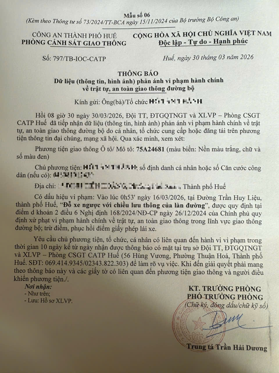 Qua hình ảnh phản ánh, người điều khiển phương tiện 75A24681 có dấu hiệu vi phạm lỗi như sau: “Đỗ xe ngược chiều lưu thông của làn đường”, quy định tại điểm d, khoản 2, điều 6 Nghị định 168/2024/NĐ-CP.