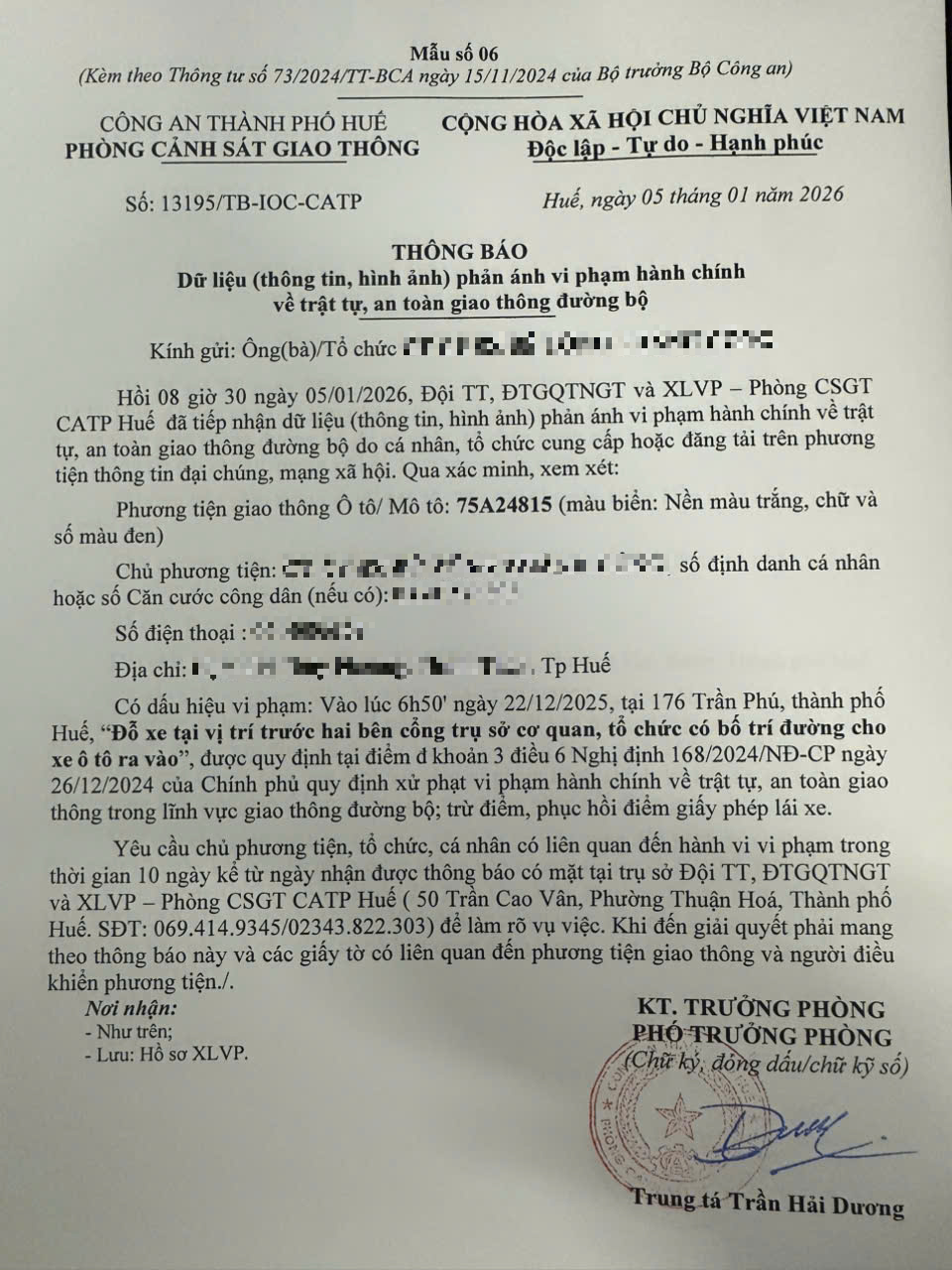 Đề nghị cơ quan chức năng xử phạt phương tiện xe BKS 75A24815 thường xuyên đỗ xe chiếm cửa ngõ ra vào. Xin cám ơn. Lúc 6h50 ngày 22/12/2025. Tại 176 Trần Phú, phường Thuận Hoá, thành phố Huế ( cổng sau trường Đại học Phú Xuân)