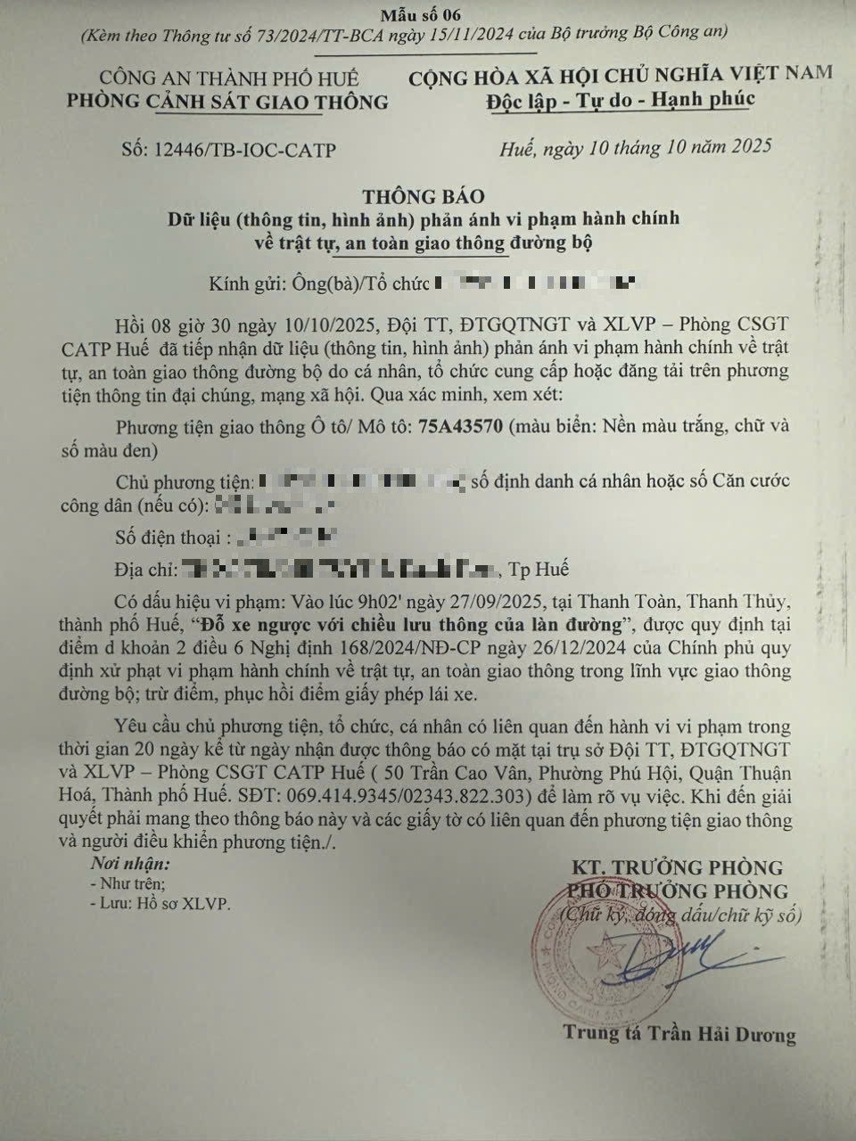 Vấn đề Ông/Bà phản ánh, Công an thành phố Huế đã chỉ đạo Phòng Cảnh sát giao thông kiểm tra và xin thông báo kết quả như sau:
