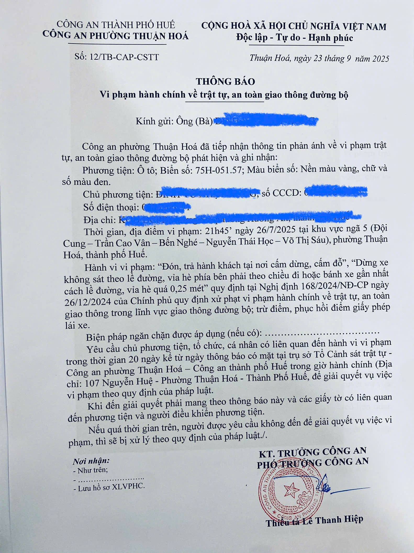 Công an phường Thuận Hóa đã lập hồ sơ, thông báo chủ phương tiện đến làm việc. Nếu quá ngày hẹn mà chủ phương tiện vẫn chưa đến trình diện tại cơ quan. Công an phường Thuận Hóa sẽ gửi thông báo cho cơ quan đăng kiểm để đưa phương tiện vào cảnh báo trên Chương trình Quản lý kiểm định.