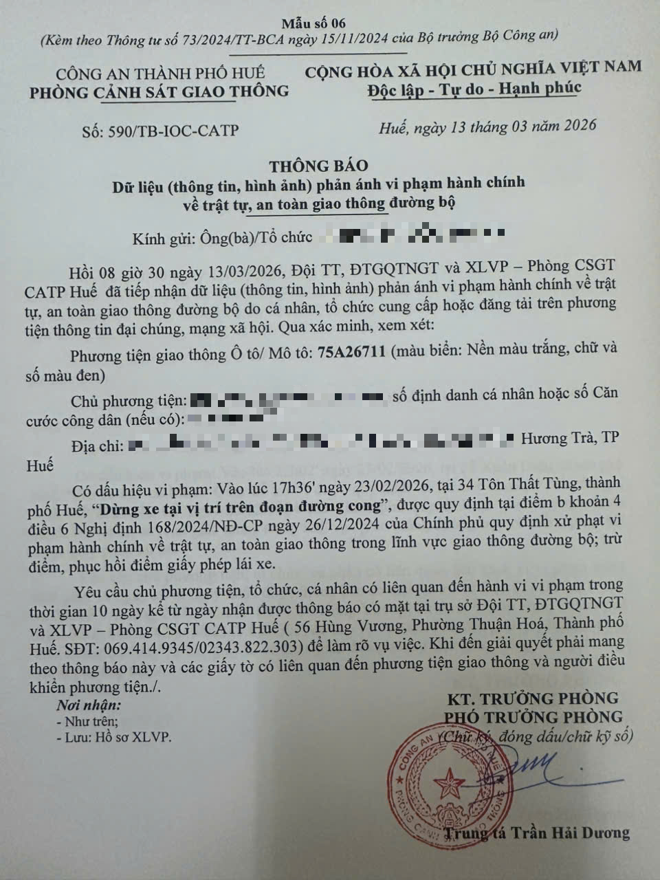 Qua hình ảnh phản ánh, Phòng Cảnh sát giao thông xác định lỗi vi phạm của người điều khiển phương tiện 75A26711 như sau: “Đỗ xe tại vị trí trên đoạn đường cong”, quy định tại điểm b, khoản 4, điều 6 Nghị định 168/2024/NĐ-CP.