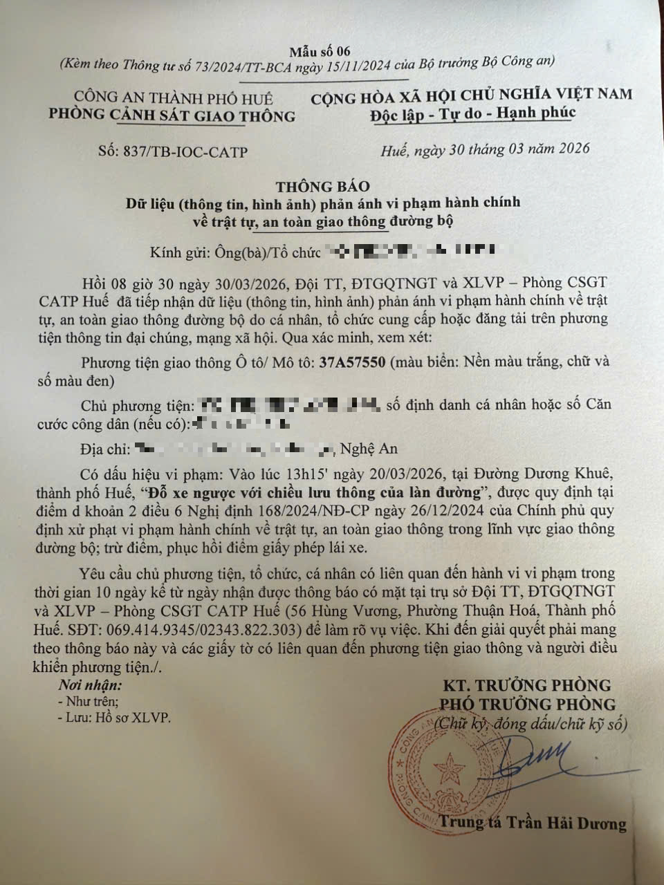 Vấn đề quý Ông/Bà phản ánh, Công an thành phố Huế đã chỉ đạo Phòng Cảnh sát giao thông kiểm tra và trả lời như sau: