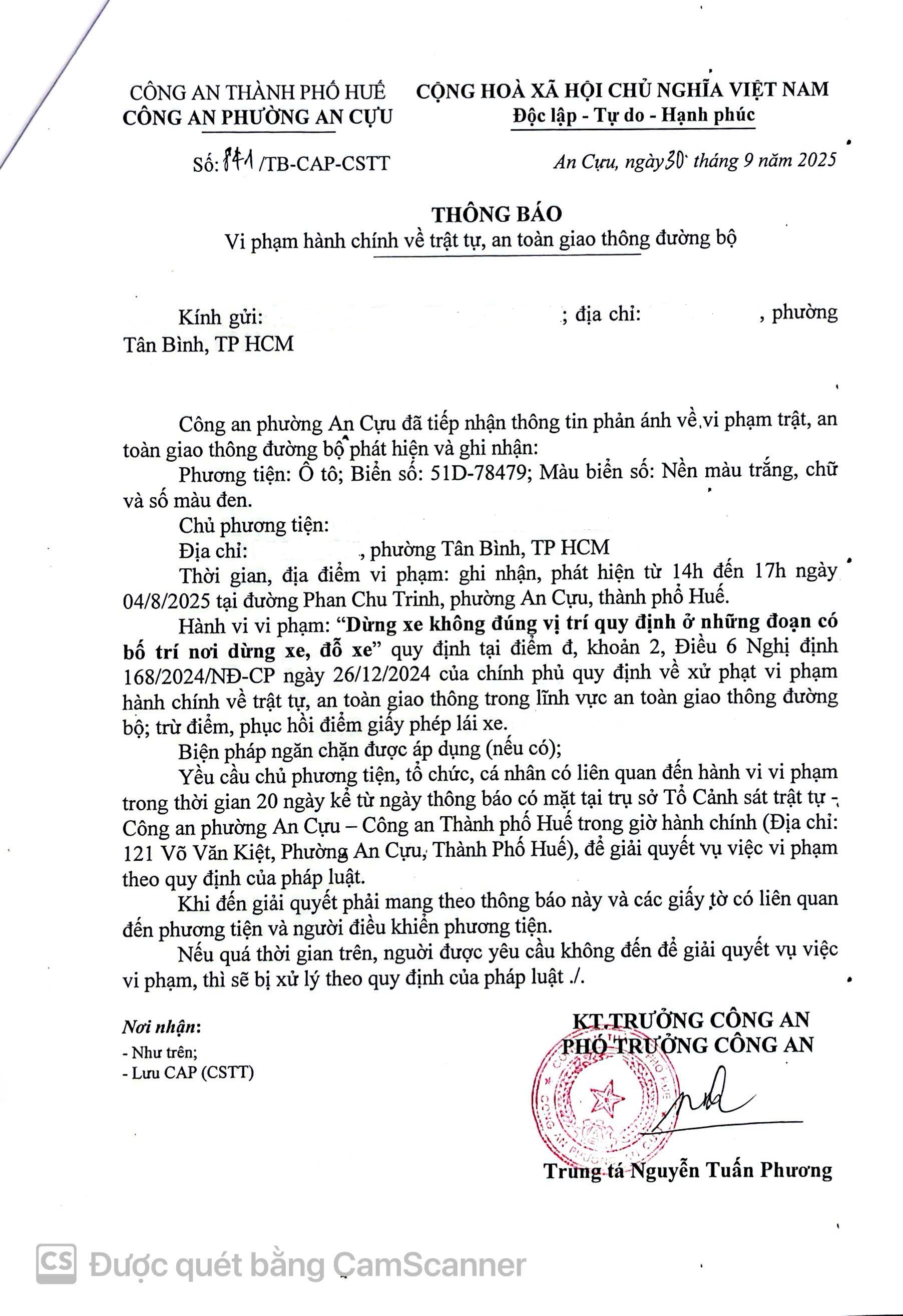 Qua hình ảnh phản ánh, Công an phường An Cựu xác định lỗi vi phạm của người điều khiển phương tiện 51D78479 như sau: “Dừng xe không đúng vị trí quy định ở những đoạn có bố trí nơi dừng xe, đỗ xe” quy định tại điểm đ, khoản 2, Điều 6 Nghị định 168/NĐ-CP ngày 26/12/2024.