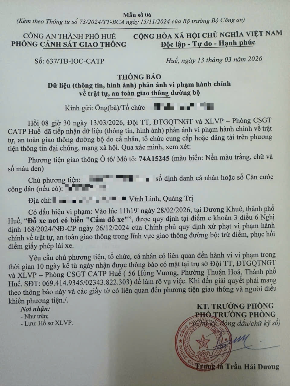 Qua hình ảnh phản ánh, Phòng Cảnh sát giao thông xác định lỗi vi phạm của người điều khiển phương tiện 74A15245 như sau:“Đỗ xe nơi có biển "Cấm đỗ xe”, quy định tại điểm e, khoản 3, điều 6 Nghị định 168/2024/NĐ-CP.