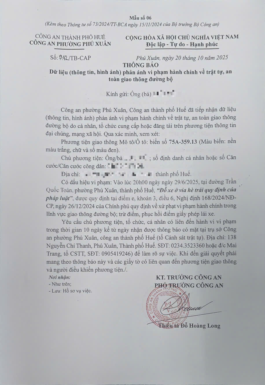 Công an phường Phú Xuân đã lập hồ sơ, thông báo chủ phương tiện đến làm việc. Tuy nhiên chủ phương tiện vẫn chưa đến trình diện tại cơ quan. Công an phường Phú Xuân sẽ gửi thông báo cho cơ quan đăng kiểm để đưa phương tiện vào cảnh báo trên Chương trình Quản lý kiểm định.