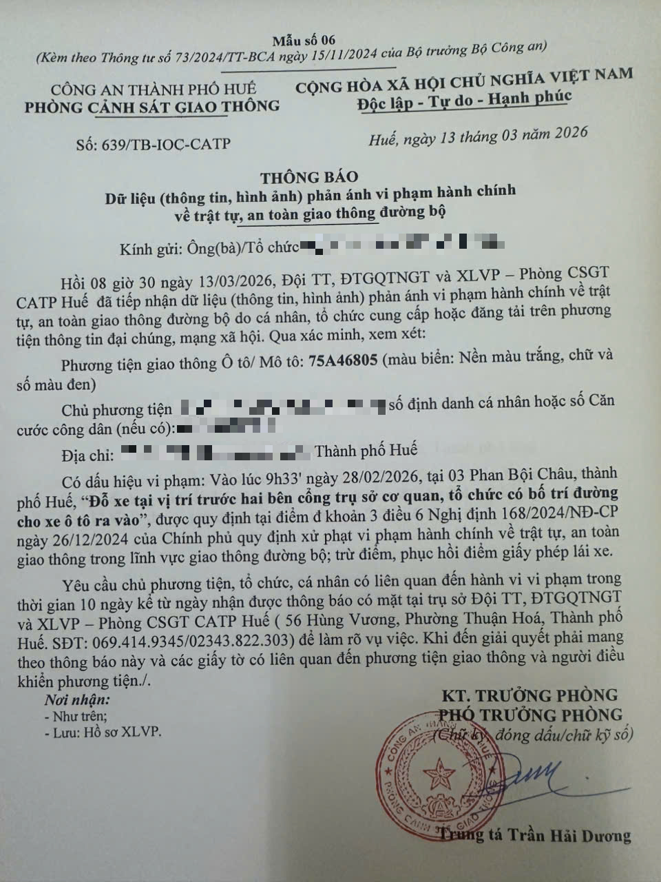 Qua hình ảnh phản ánh, Phòng Cảnh sát giao thông xác định lỗi vi phạm của người điều khiển phương tiện 75A46805 như sau: “Đỗ xe tại vị trí trước hai bên cổng trụ sở cơ quan, tổ chức có bố trí đường cho xe ô tô ra vào”, quy định tại điểm đ, khoản 3, điều 6 Nghị định 168/2024/NĐ-CP.