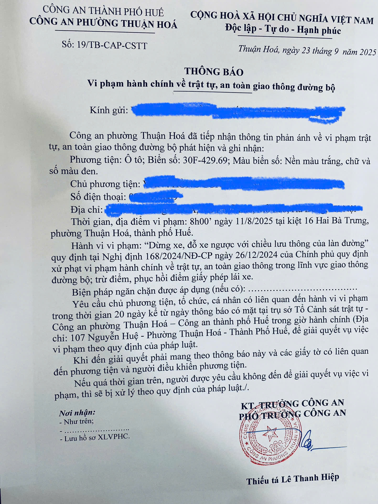 Công an phường Thuận Hóa đã lập hồ sơ, thông báo chủ phương tiện đến làm việc. Nếu quá ngày hẹn mà chủ phương tiện vẫn chưa đến trình diện tại cơ quan. Công an phường Thuận Hóa sẽ gửi thông báo cho cơ quan đăng kiểm để đưa phương tiện vào cảnh báo trên Chương trình Quản lý kiểm định.