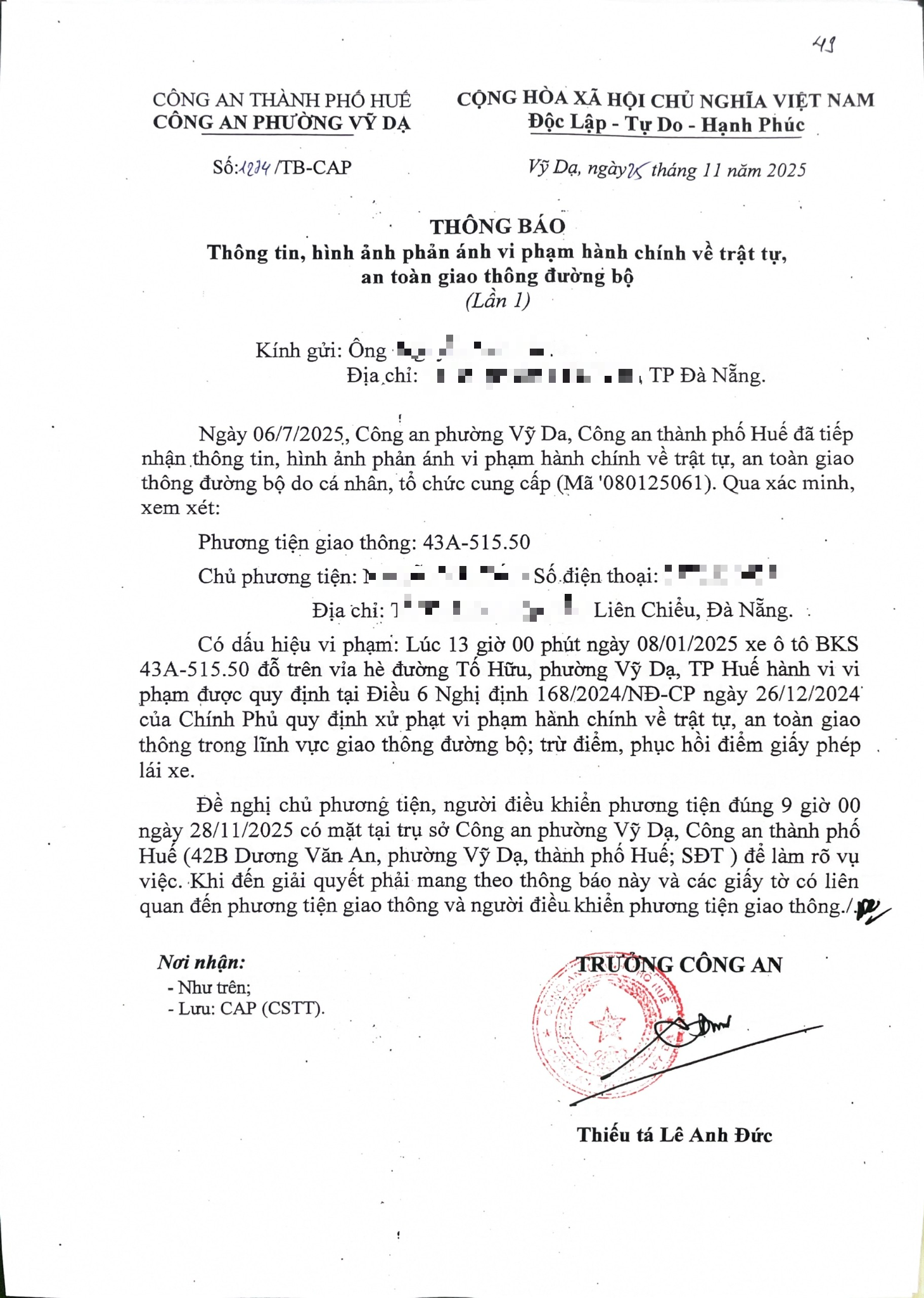 Công an phường Vỹ Dạ đã lập hồ sơ, thông báo chủ phương tiện đến làm việc. Tuy nhiên hiện chủ phương tiện vẫn chưa trình diện tại cơ quan. Công an phường Vỹ Dạ sẽ tiếp tục tăng cường thực hiện công tác tuần tra trên địa bàn, kịp thời phát hiện, xử lý các hành vi vi phạm theo quy định.