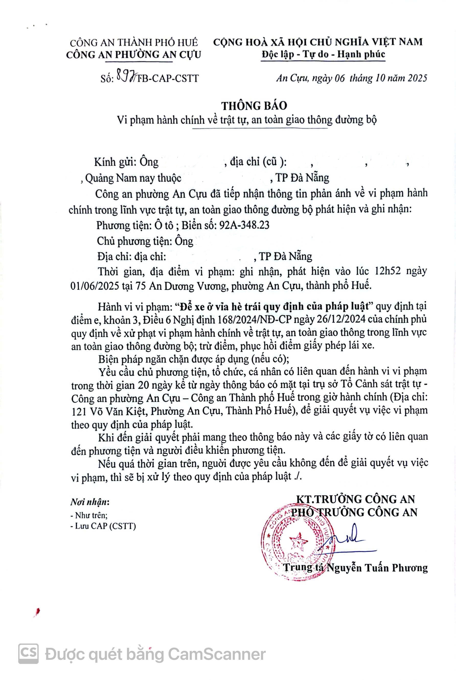 Công an phường An Cựu đã gửi thông báo yêu cầu chủ phương tiện đến làm việc theo quy định của pháp luật.