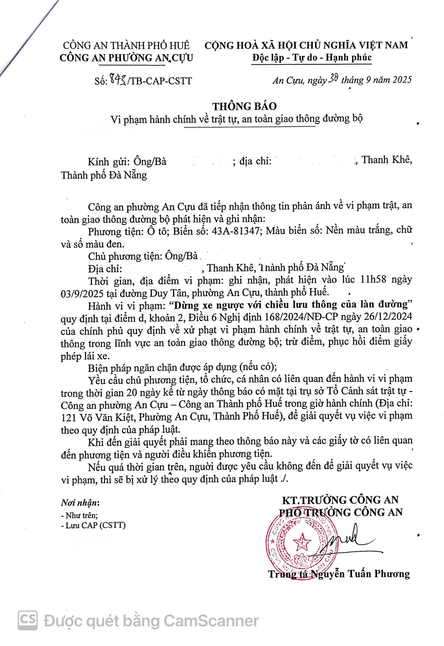 Công an phường An Cựu đã gửi thông báo yêu cầu chủ phương tiện đến làm việc theo quy định của pháp luật. Đồng thời, gửi thông báo đến Công an xã/ phường/ thị trấn (nơi thường trú của chủ phương tiện).
