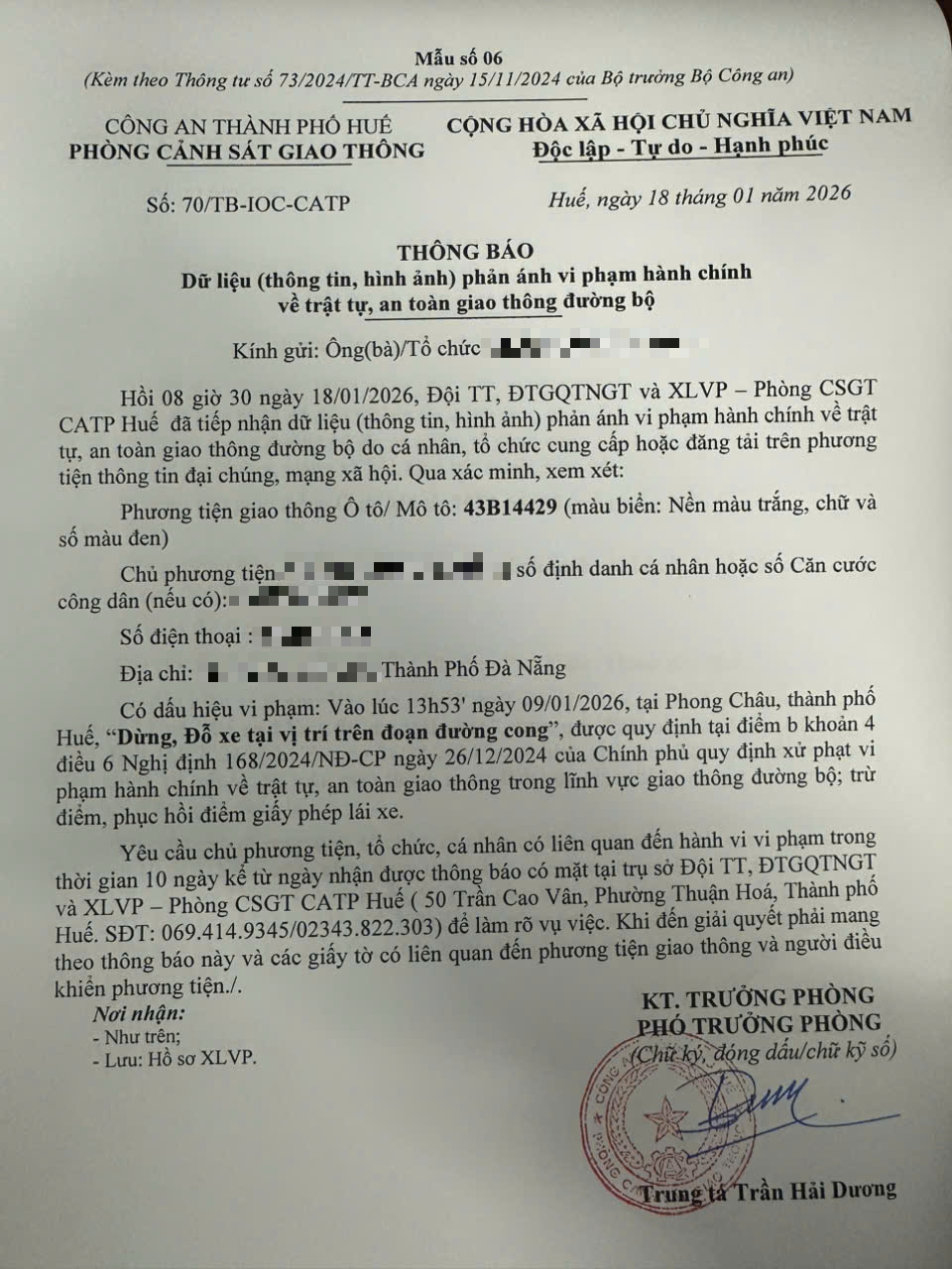 Vấn đề quý Ông/Bà phản ánh, Phòng Cảnh sát giao thông – Công an thành phố Huế đã kiểm tra và xin thông báo kết quả như sau: