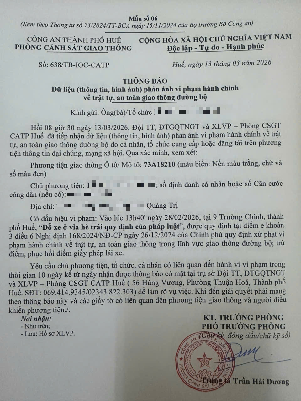 Vấn đề quý Ông/Bà phản ánh, Phòng Cảnh sát giao thông – Công an thành phố Huế đã kiểm trả và xin thông báo kết quả như sau: