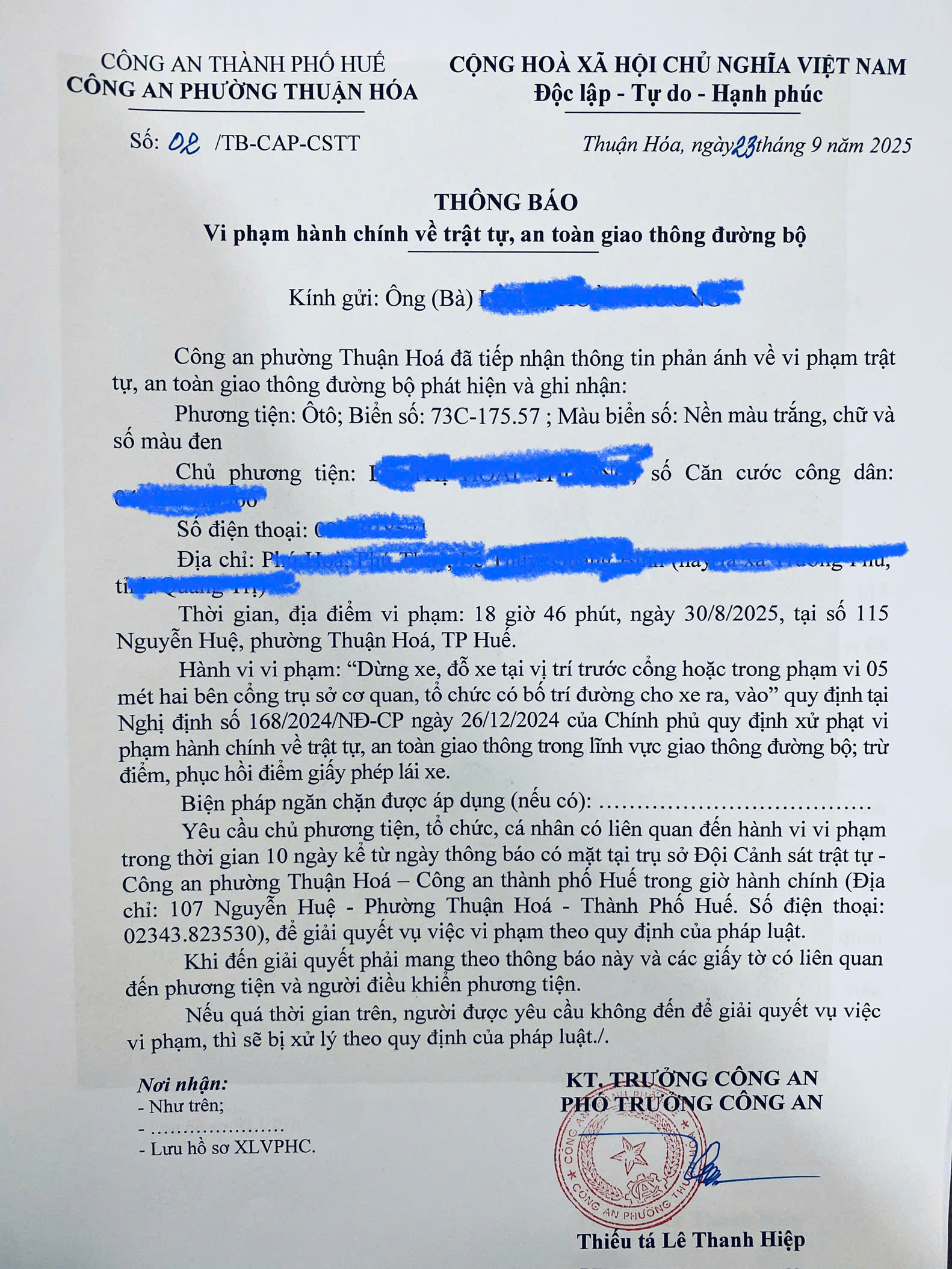 Công an phường Thuận Hóa đã lập hồ sơ, thông báo chủ phương tiện đến làm việc. Tuy nhiên, chủ phương tiện vẫn chưa đến trình diện tại cơ quan. Công an phường Thuận Hóa sẽ gửi thông báo cho cơ quan đăng kiểm để đưa phương tiện vào cảnh báo trên Chương trình Quản lý kiểm định.