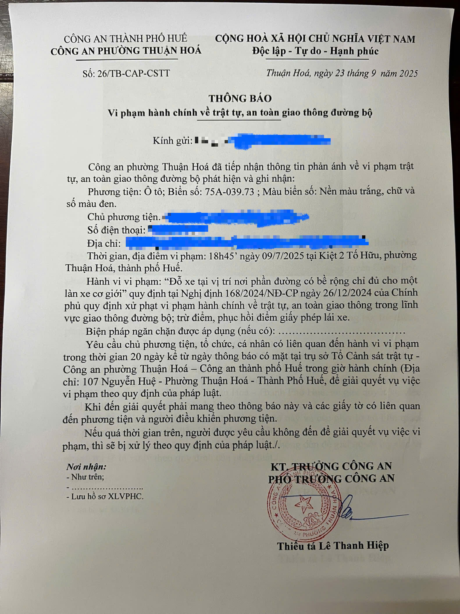 Công an phường Thuận Hóa đã lập hồ sơ, thông báo chủ phương tiện đến làm việc. Nếu quá ngày hẹn mà chủ phương tiện vẫn chưa đến trình diện tại cơ quan. Công an phường Thuận Hóa sẽ gửi thông báo cho cơ quan đăng kiểm để đưa phương tiện vào cảnh báo trên Chương trình Quản lý kiểm định.