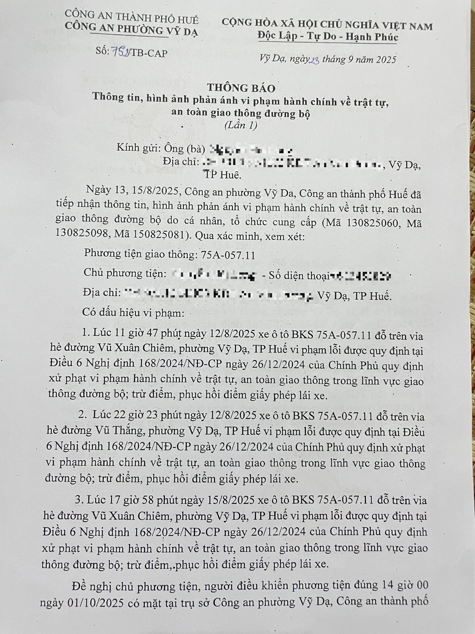 Xe ô tô BKS 75A05711 đỗ trên vỉa hè đường Vũ Xuân Chiêm, phường Vỹ Dạ, vi phạm lỗi quy định tại Điều 5 Nghị định 100/2019/NĐ-CP. Đề nghị cơ quan chức năng xử lý đúng quy định. Ảnh chụp lúc 11h47p ngày 12/8/2025.